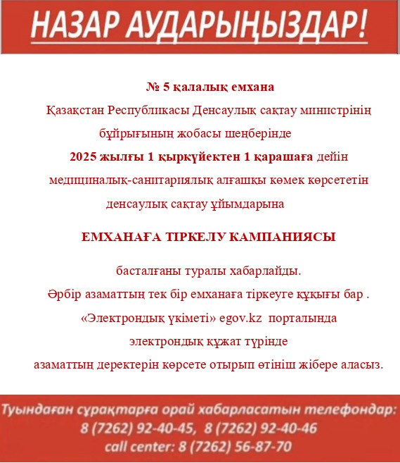 №5 қалалық емхана Қазақстан Республикасы Денсаулық сақтау министрінің бұйрығының жобасы шеңберінде 2025 жылғы 1 қыркүйектен 1 қарашаға дейін медициналық-санитариялық алғашқы көмек көрсететін денсаулық сақтау ұйымдарына ЕМХАНАҒА ТІРКЕЛУ КАМПАНИЯСЫ басталғаны туралы хабарлайды.