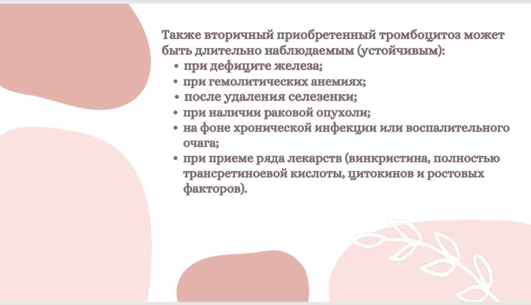 Также вторичный приобретенный тромбоцитоз может быть длительно наблюдаемым (устойчивым): • при дефиците железа; • при гемолитических анемиях; • после удаления селезенки; • при наличии раковой опухоли; . на фоне хронической инфекции или воспалительного очага; • при приеме ряда лекарств (винкристина, полностью трансретиноевой кислоты, цитокинов и ростовых факторов).
