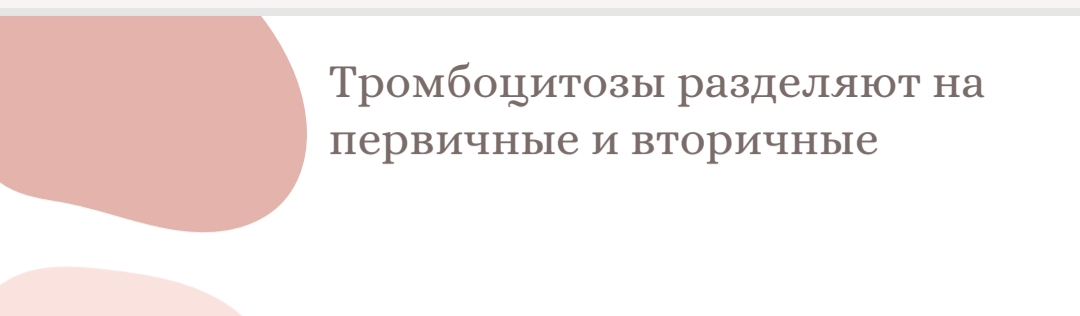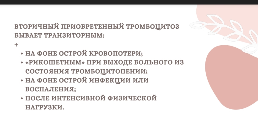ВТОРИЧНЫЙ ПРИОБРЕТЕННЫЙ ТРОМБОЦИТОЗ БЫВАЕТ ТРАНЗИТОРНЫМ: + • НА ФОНЕ ОСТРОЙ КРОВОПОТЕРИ; • «РИКОШЕТНЫМ» ПРИ ВЫХОДЕ БОЛЬНОГо из состояния ТРОМБОЦИТОПЕНИИ; • НА ФОНЕ ОСТРОЙ ИНФЕКЦИИ или ВОСПАЛЕНИЯ; • ПОСЛЕ ИНТЕНСИВНОЙ ФИЗИЧЕСКОЙ НАГРУЗКИ.