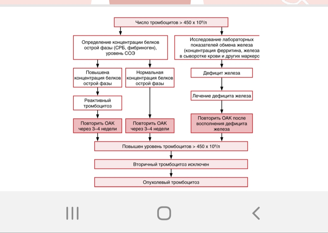 Число тромбоцитов 450 x 109/л Определение концентрации белков острой фазы (СРБ, фибриноген), уровень соз Повышена концентрация белков острой фазы Реактивный тромбоцитоз Повторить ОАК через 3-4 недели Нормальная концентрация белков острой фазы Исследование лабораторных показателей обмена железа (концентрация ферритина, железа в сыворотке крови и других маркеро Дефицит железа Лечение дефицита железа Повторить ОАК через 3-4 недели Повторить ОАК после восполнения дефицита железа Повышен уровень тромбоцитов 450 х 10%л Вторичный тромбоцитоз исключен Опухолевый тромбоцитоз 0