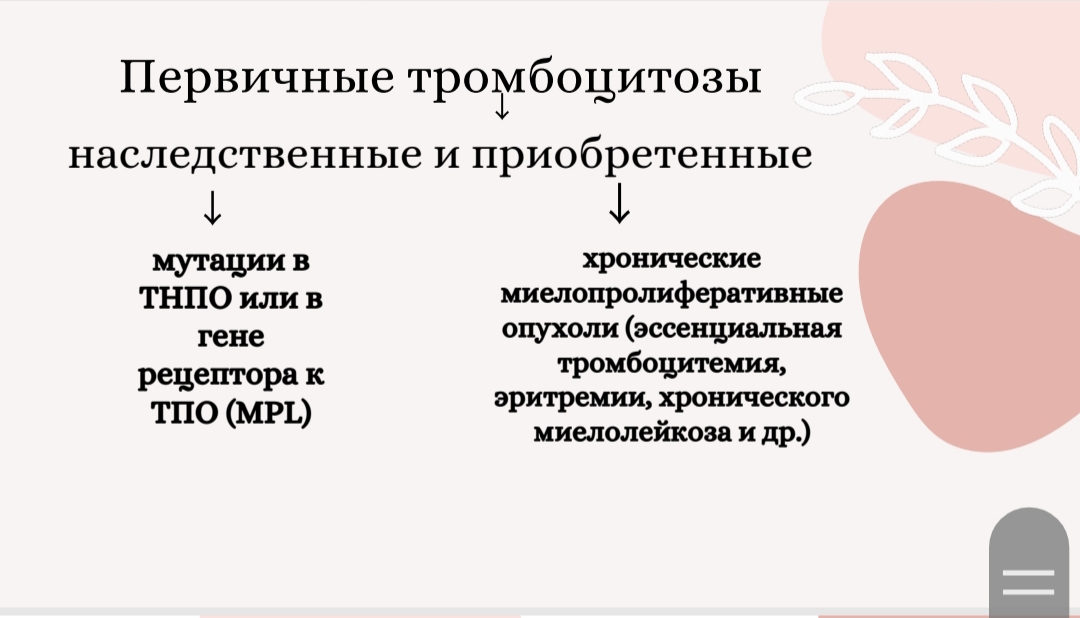 Первичные тромбоцитозы наследственные и приобретенные мутации в ТНПО или в гене рецептора к THIO (MPL) хронические миелопролиферативные опухоли (эссенциальная тромбоцитемия, эритремии, хронического миелолейкоза и др.)