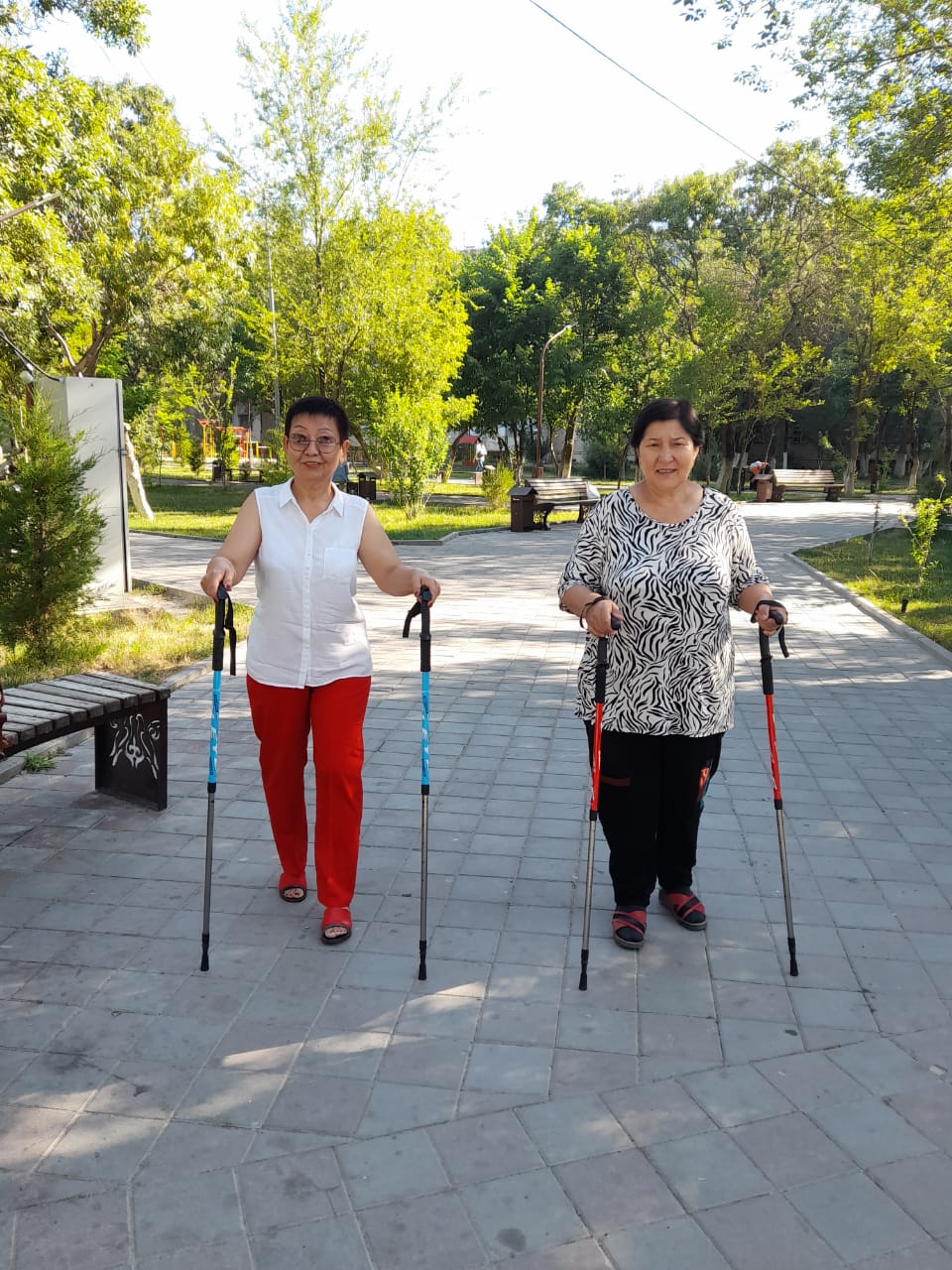 Медсестра кабинета здорового образа жизни городской поликлиники №5 Клиева Жамыл Керимбаевна каждый вторник проводит утреннюю гимнастику для пожилых людей в парке здоровья, измеряет артериальное давление, показала ходьбу со скандинавской палкой, как заниматься йогой, обучает здоровому образу жизни и правильному питанию.