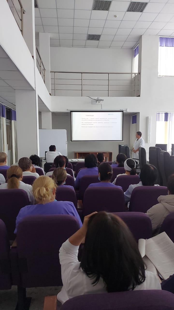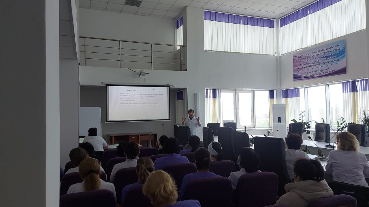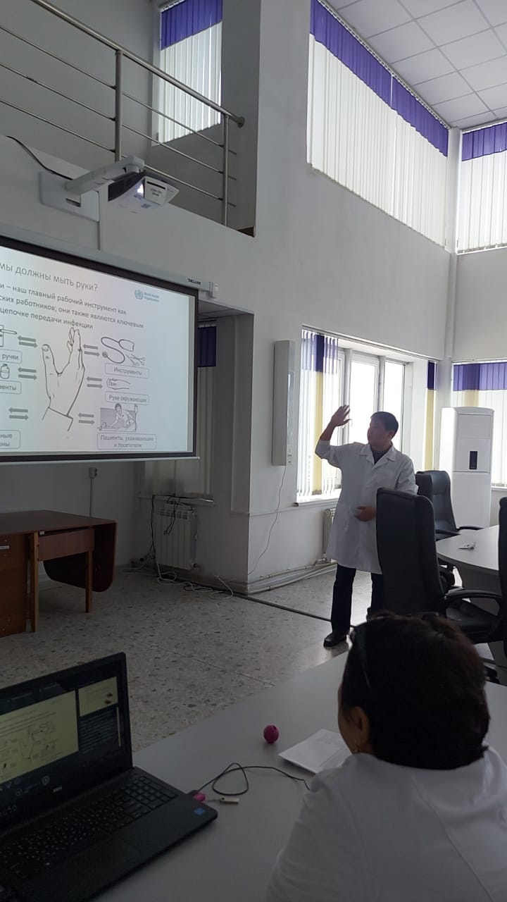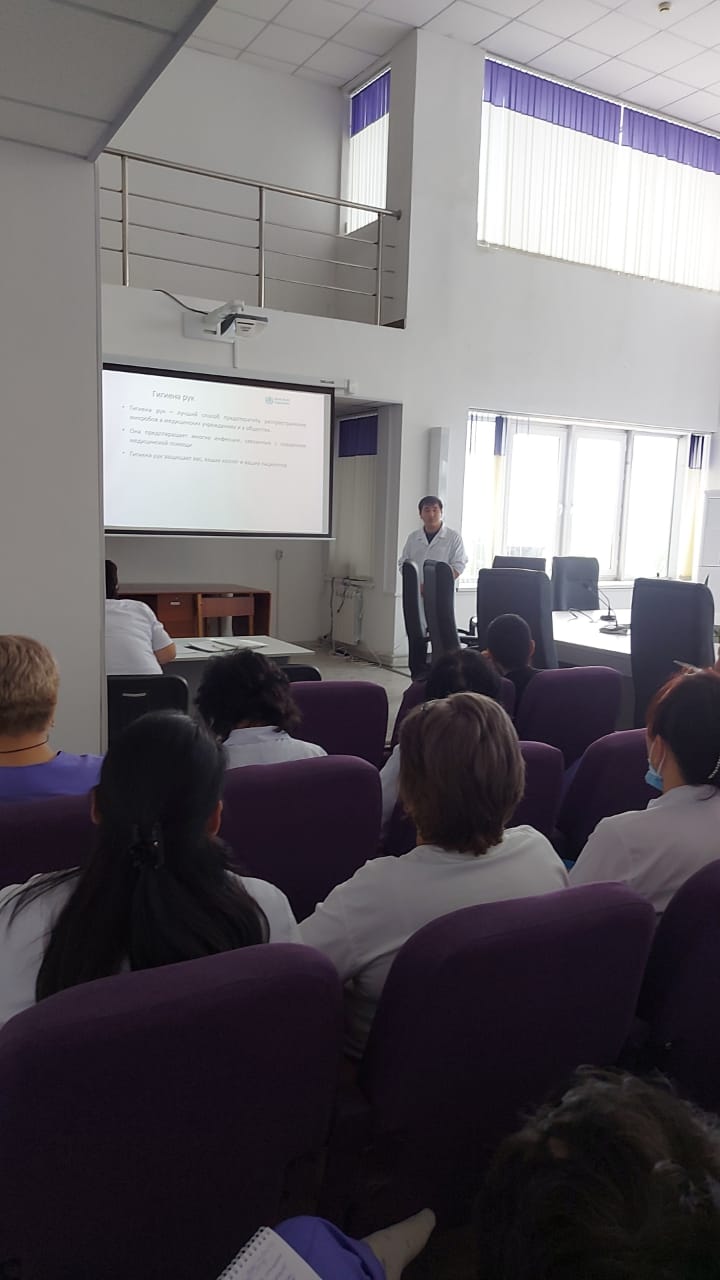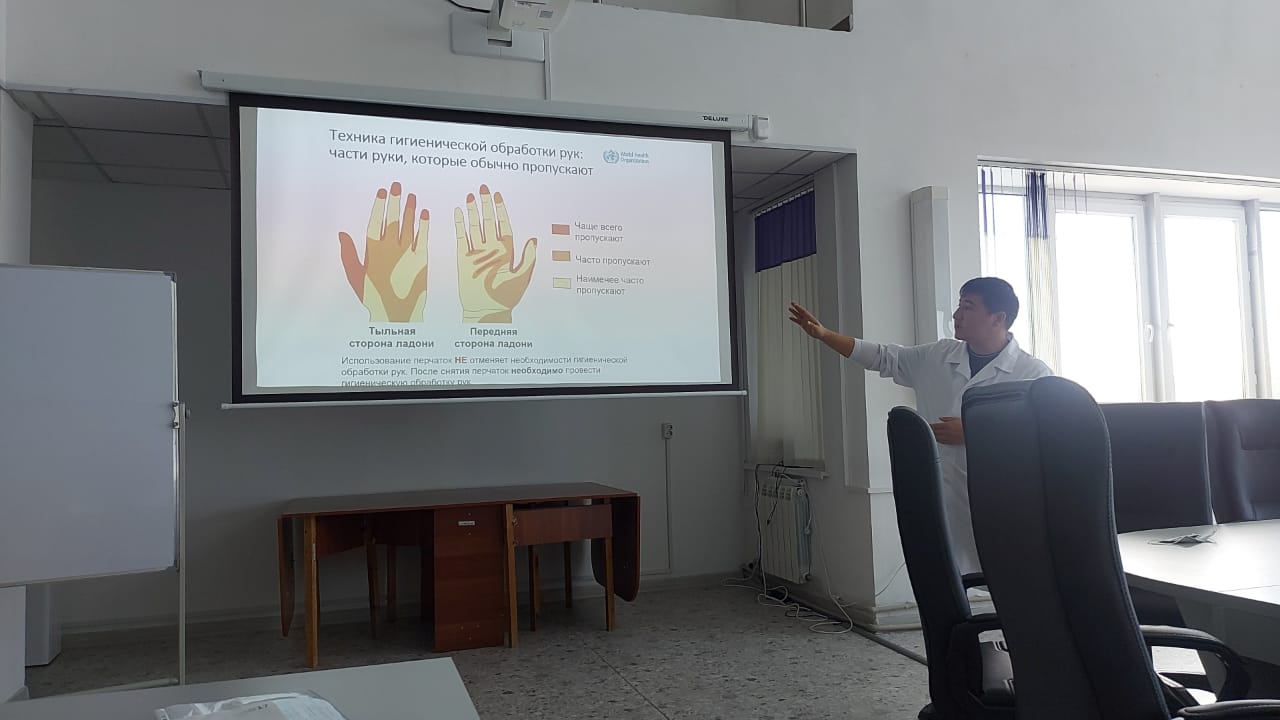 31 августа 2023 года эпидемиолог Ахмет Улан Мураталиевич провел семинар для сотрудников поликлиники на тему «Алгоритм мытья рук» согласно Приказа №151.