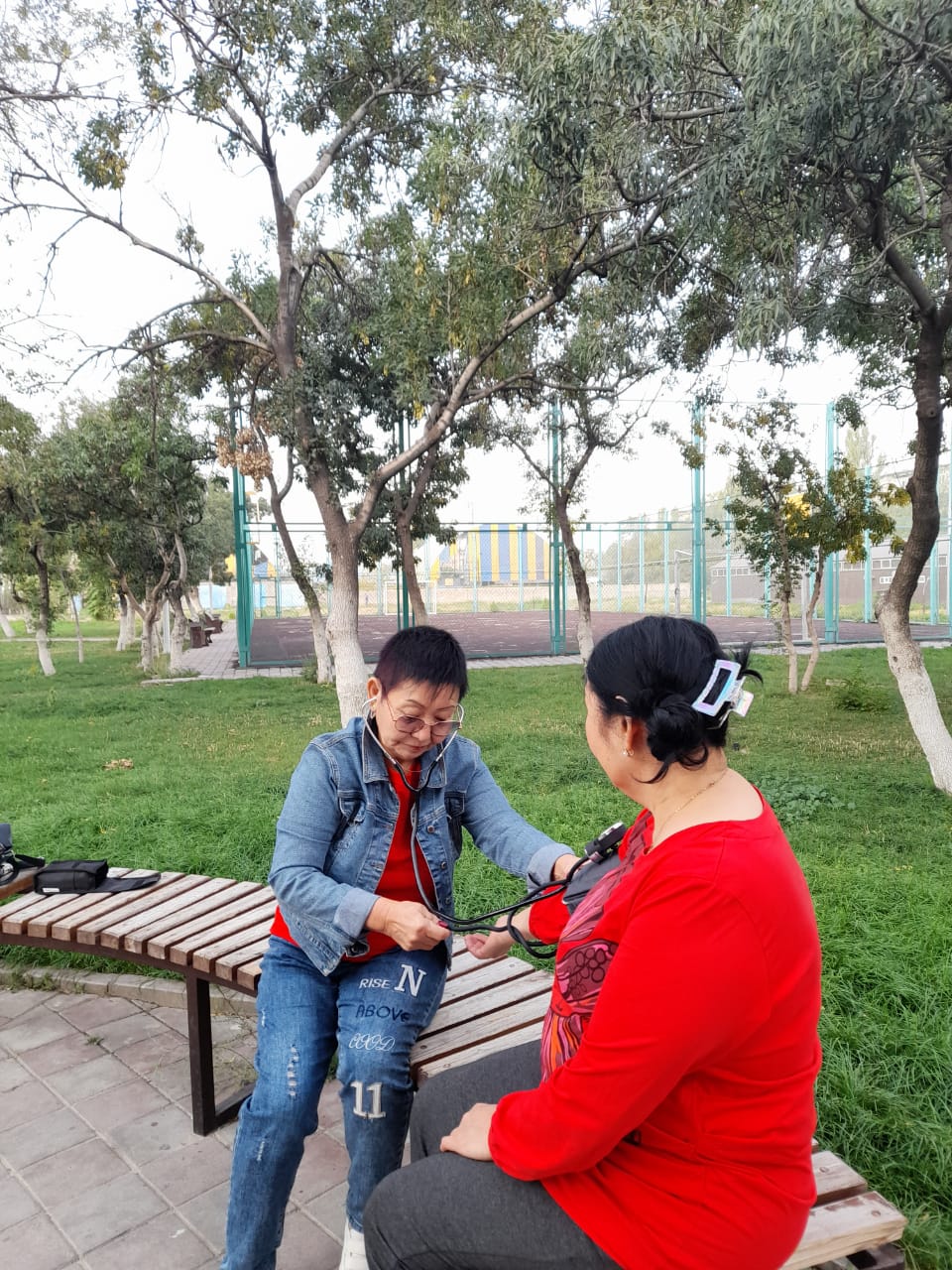 №5 қалалық емхананың салауатты өмір салтын насихаттау бөлмесінің мейіргері Клиева Жамыл Керимбаевна денсаулық саябағында әр аптаның сейсенбі күні егде жастағы адамдарға таңертеңгілік жаттығулар өткізеді, қан қысымын өлшеп, салауатты өмір салты мен дұрыс тамақтану туралы түсінік жұмыстарын жүргізеді Медсестра кабинета здорового образа жизни городской поликлиники №5 Клиева Жамыл Керимбаевна каждый вторник проводит утреннюю гимнастику для пожилых людей в парке здоровья, измеряет артериальное давление, обучает здоровому образу жизни и правильному питанию.