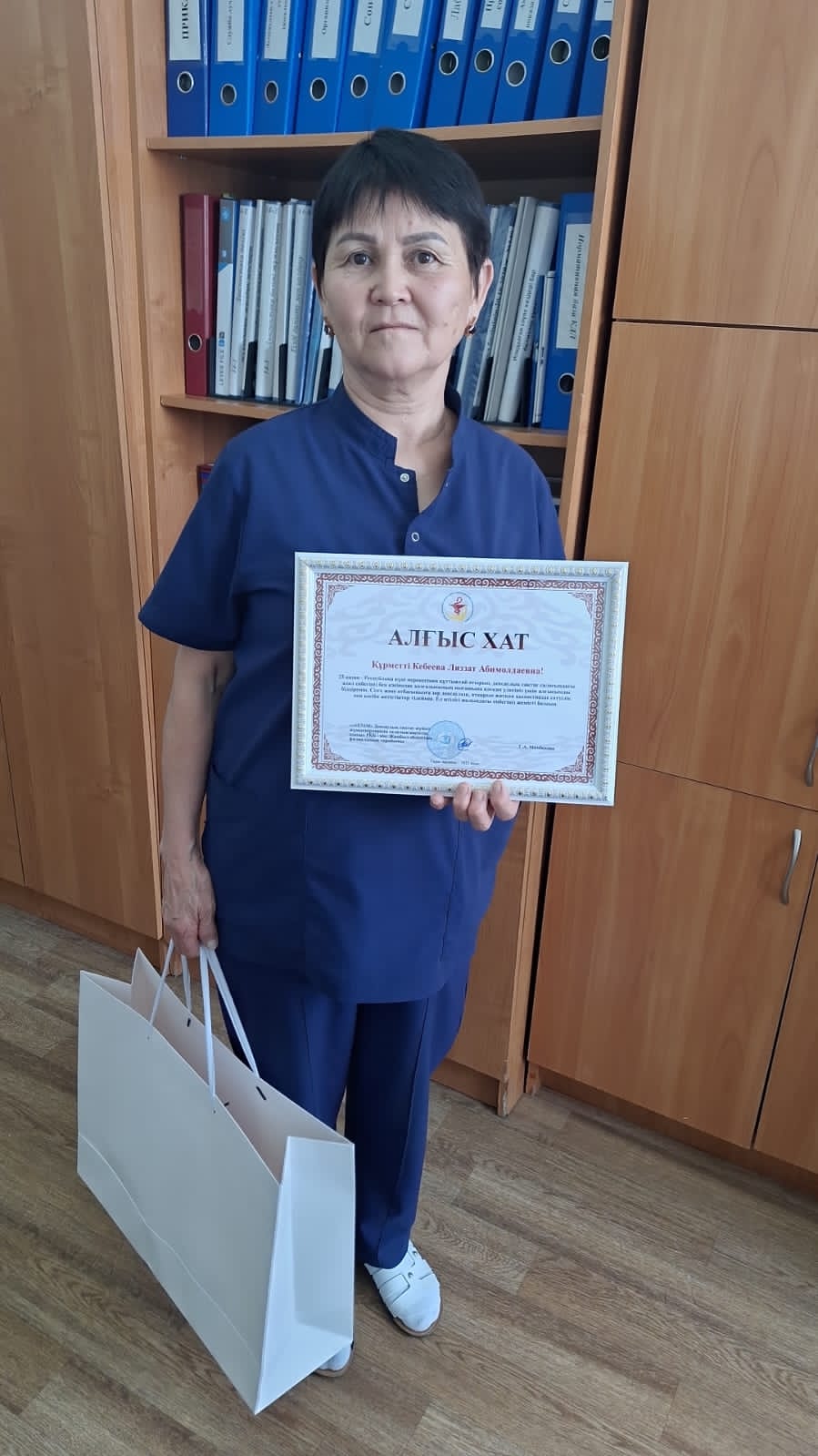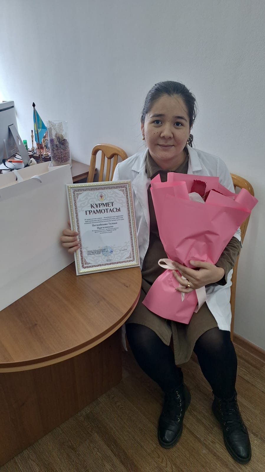 Собравшихся сотрудников с главным национальным праздником нашей страны— Днем Республики Казахстан поздравила главный врач Сарсенова Д.А., председатель профсоюзного комитета Аширбаева Г.С. и вручили почетные грамоты с сувенирами. Пожелали всем благополучия, счастья, здоровья, мира и добра!