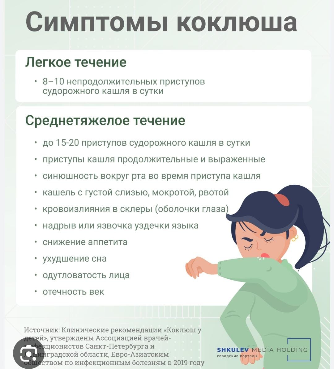 Чаще заболевают дети дошкольного возраста. Инкубационный период длится от 7 до 14 дней. Заражение происходит воздушно-капельным путём при прямом контакте с заражённым человеком. Больной заразен с 1-го до 25-го дня заболевания. Длительность заразного периода может сократиться при своевременном проведении антибактериальной терапии. Наблюдается носительство бордетеллы пертуссис у взрослых людей. В том числе среди потенциально опасных контактных лиц могут находиться сотрудники детских дошкольных учреждений, поскольку скрытая форма инфекции внешне никак не проявляется. Пациент опасен для окружающих людей на протяжении 30 дней с момента проявления первых симптомов болезни.