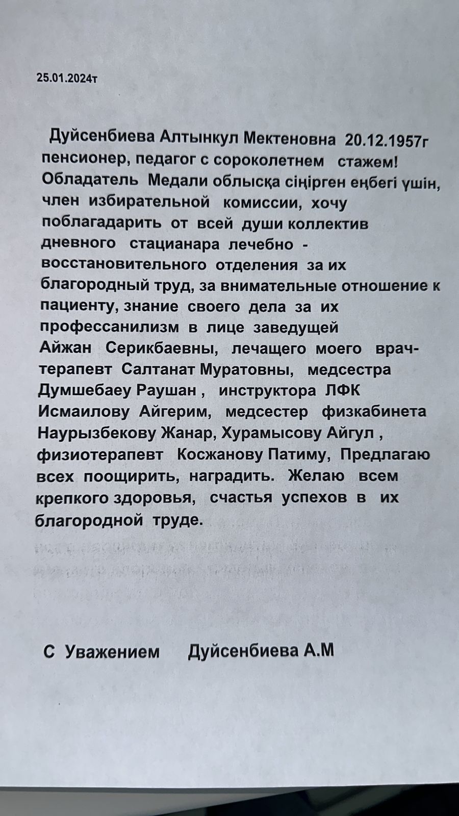 Хочу поблагодарить от всей души коллектив дневного стационара лечебно-восстановительного отделения городской поликлиники №5. За их благородный труд, за внимательное отношение к пациенту, знание своего дела, за их профессионализм в лице заведующего отделением Айжан Серикбаевна, лечащего врача Салтанат Муратовна, медсестры Думшебаева Раушан, инструктора ЛФК Исмалова Айгерим, медсестер физ.кабинета Наурызбекова Жанар, Курамысова Айгуль, врача физиотерапевта Косжанова Патима Кабылбековна.