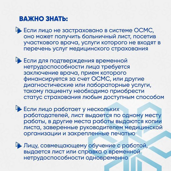 Если пациент не застрахован в системе ОСМС, то он может получить больничный лист, посетив участкового врача, услуги которого не входят в перечень медуслуг, предоставляемых в системе ОСМС. Однако, если для подтверждения временной нетрудоспособности пациента требуется заключение врача, прием которого финансируется за счет ОСМС или другие диагностические или лабораторные услуги, то такому пациенту необходимо приобрести статус страхования любым доступным способом.