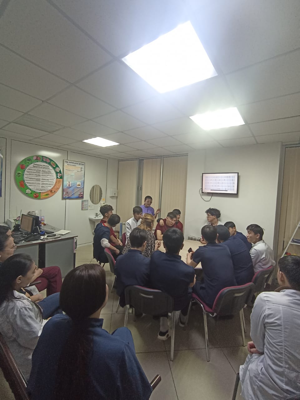 Клиева Ж. провела круглый стол среди студентов на тему "Профилактика вредных привычек", "Пропаганда здорового образа жизни", "Профилактика рака шейки матки", "Профилактика острой респираторной вирусной инфекции" ответила на вопросы, показала видеоролик, раздала буклеты