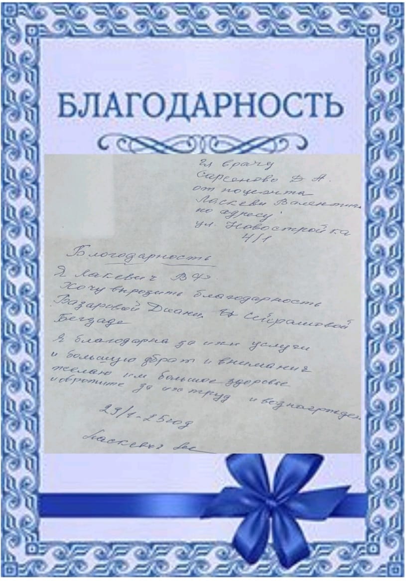 Я Ласкевич В.Ф. хочу выразить благодарность социальному работнику Базаровой Диане, психологу Сейдрашовой Бекзаде.