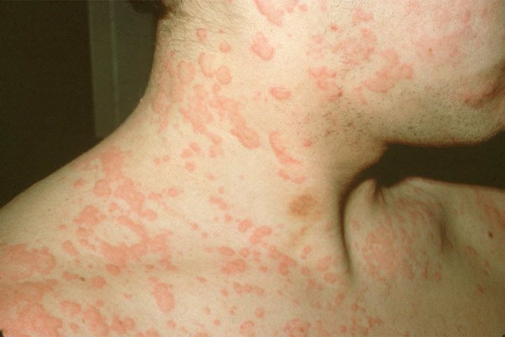 Длительный приём лекарственных препаратов, особенно антибиотиков, также способен спровоцировать аллергическую реакцию. Места локализации аллергии и красных пятен, сопровождающих её, могут встречаться по всему телу.