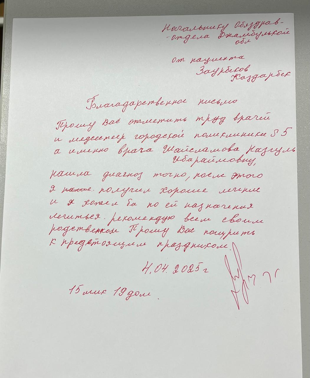 Жамбыл облысы Денсаулық сақтау департаментінің басшысының атына пациент Заурбеков Қыздарбектен