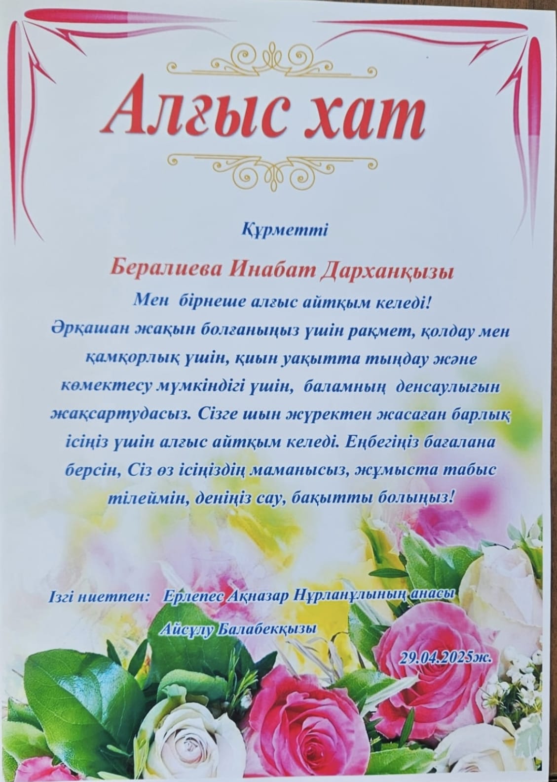 Алғыс хат Бұл Алғыс Хатта емделуші пациент емхананың психолог маманы Бералиева Инабат Дарханқызының жұмысына жоғары баға беріп алғысын білдірді.