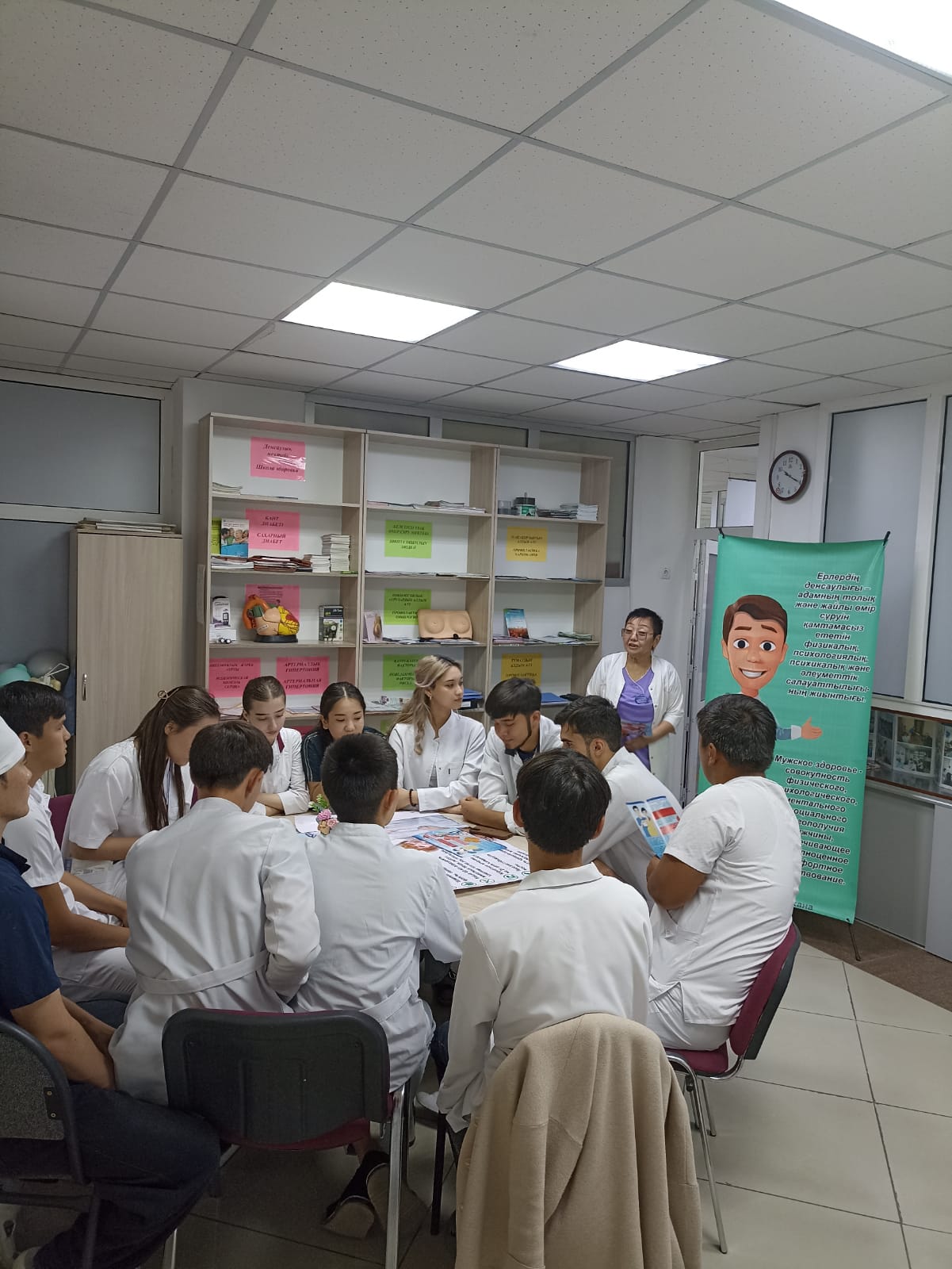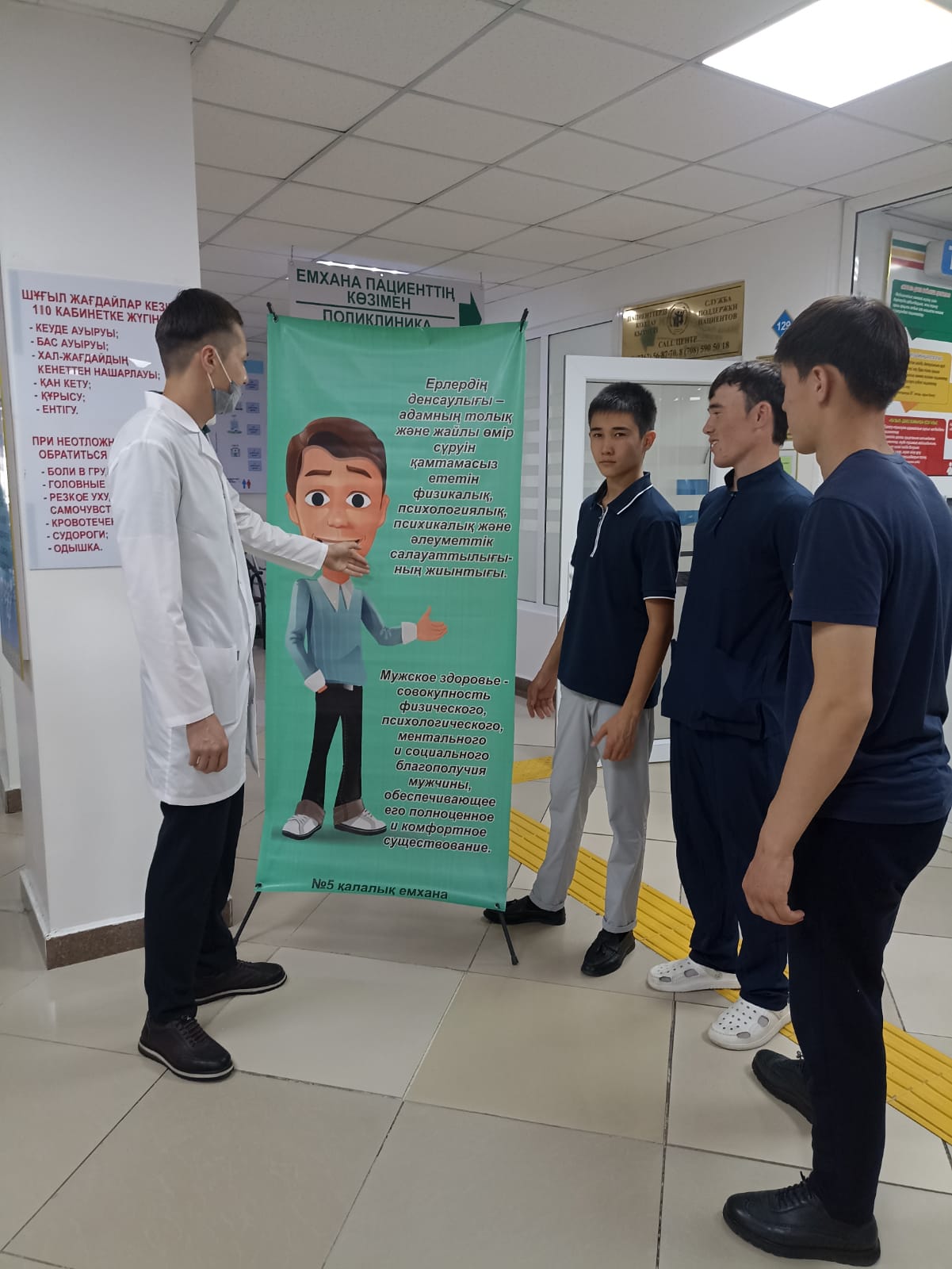 14 мая 2025 года в городской поликлинике №5 прошел день открытых дверей и проведены семинарские занятия медсестрой кабинета здровый образ жизни Клиевой Ж.К., медбратом мужского смотрового кабинета Наби А.А.среди студентов на темы «Мужское здоровье» и «Репродуктивное здоровье», даны ответы на интересующие вопросы, показаны видеоролики, розданы буклеты.