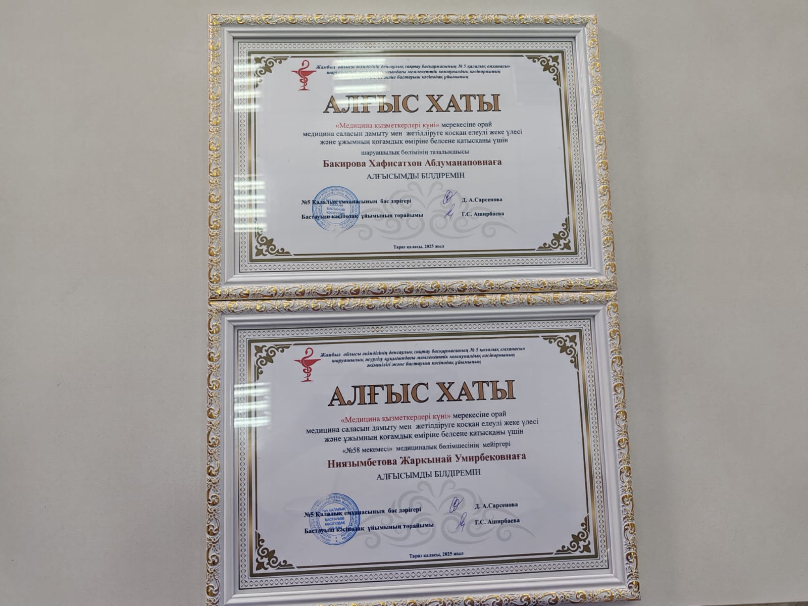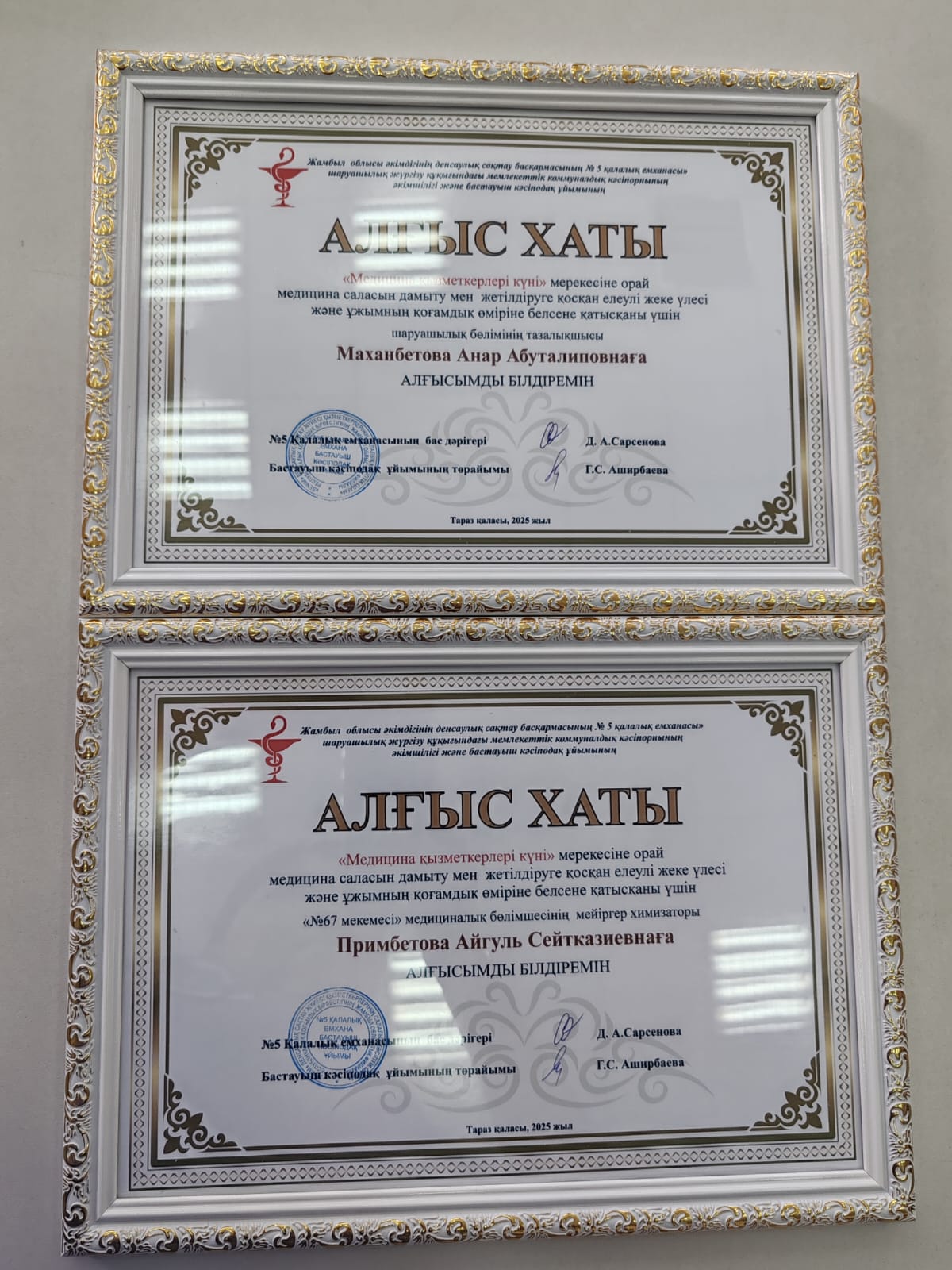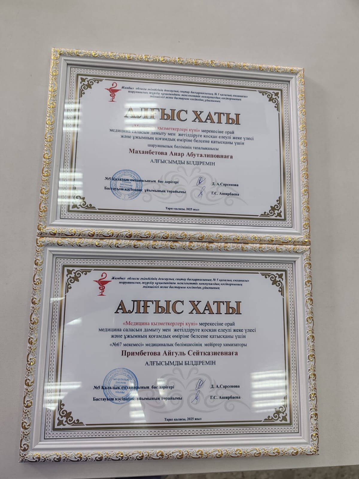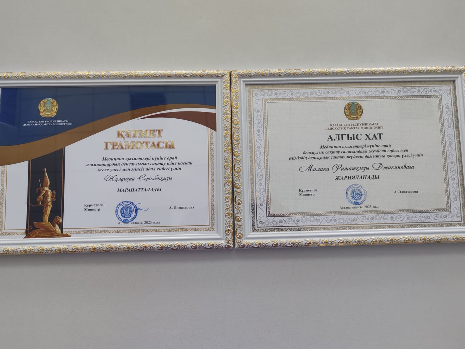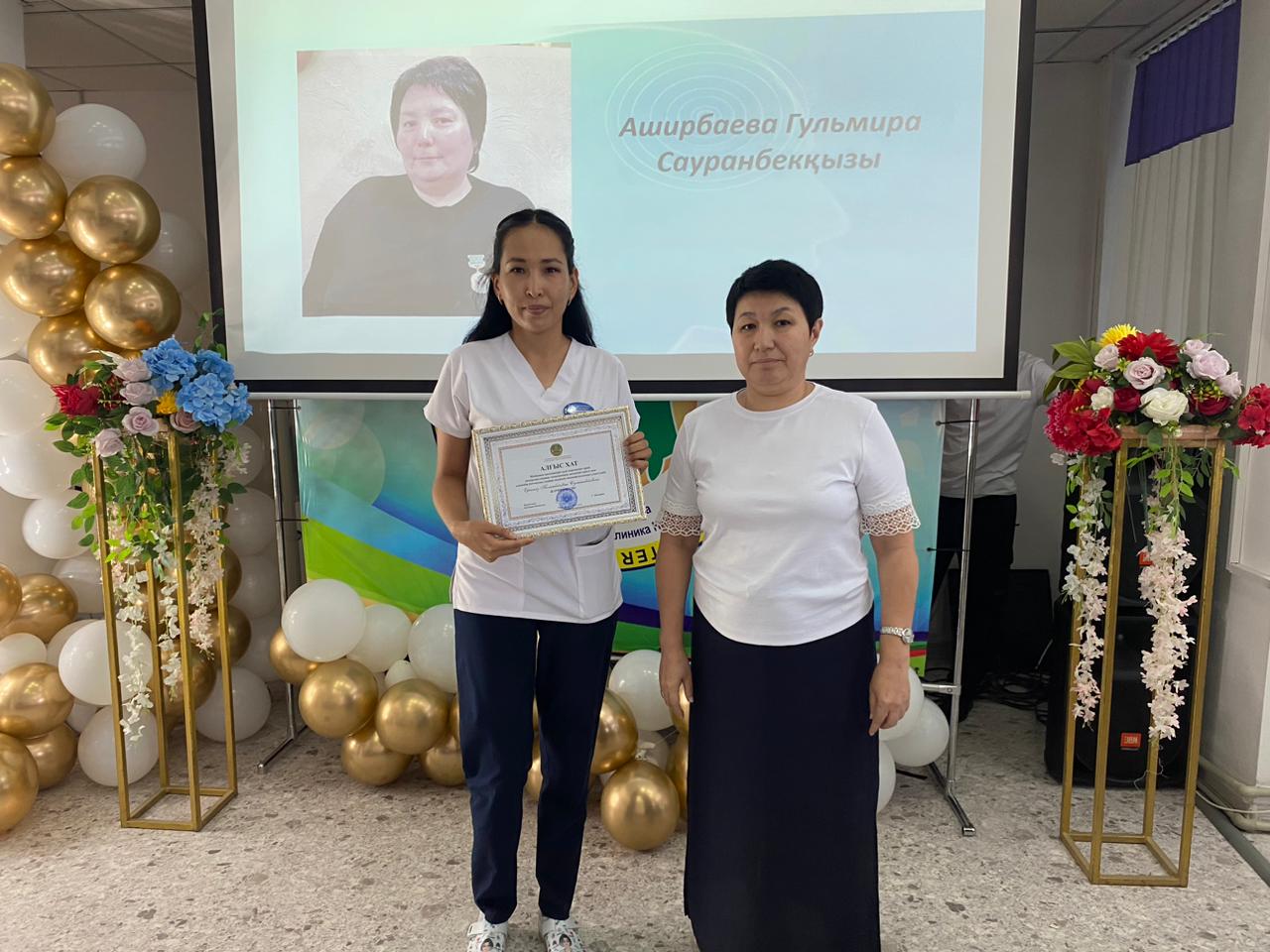 жоғары кәсіби шеберлігі үшін, қызметтік міндеттерін адал атқарғаны және емхананың дамуына қосқан жеке үлесі үшін бас дәрігер Д.А.Сарсенова атынан, бастауыш кәсіподақ ұйымының төрайымы Г.С.Аширбаева атынан АЛҒЫС ХАТТАРМЕН марапатталды.