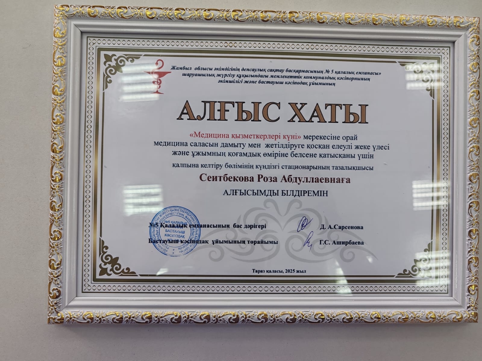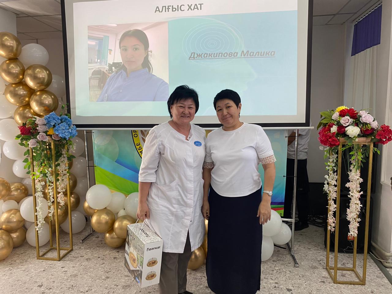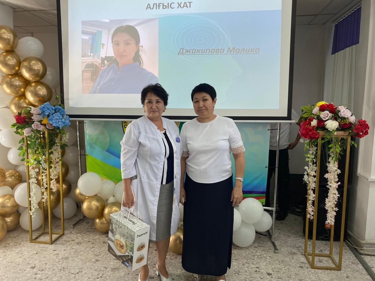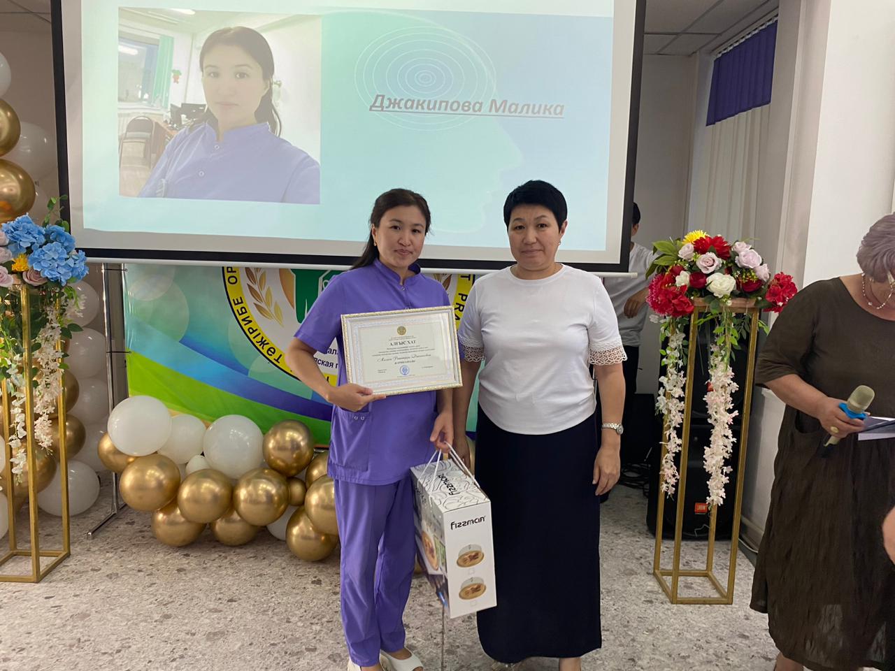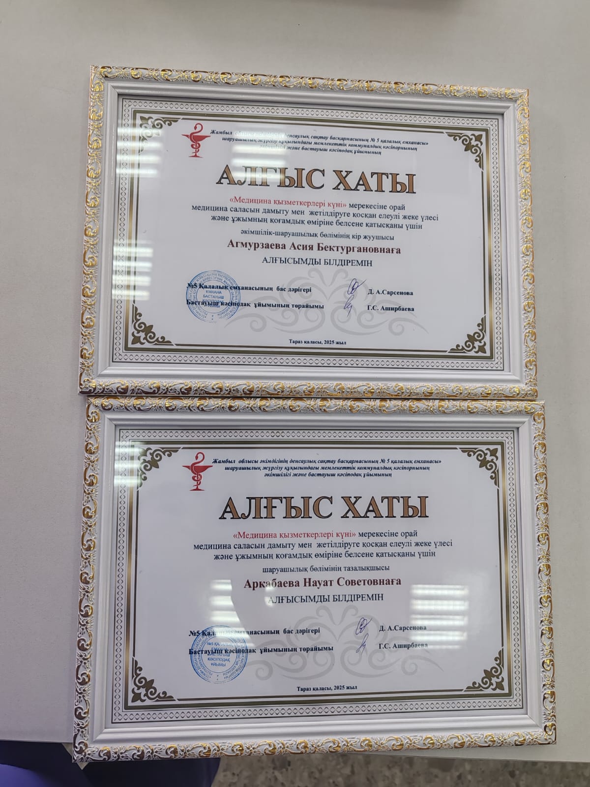 жоғары кәсіби шеберлігі үшін, қызметтік міндеттерін адал атқарғаны және емхананың дамуына қосқан жеке үлесі үшін бас дәрігер Д.А.Сарсенова атынан, бастауыш кәсіподақ ұйымының төрайымы Г.С.Аширбаева атынан АЛҒЫС ХАТТАРМЕН марапатталды.