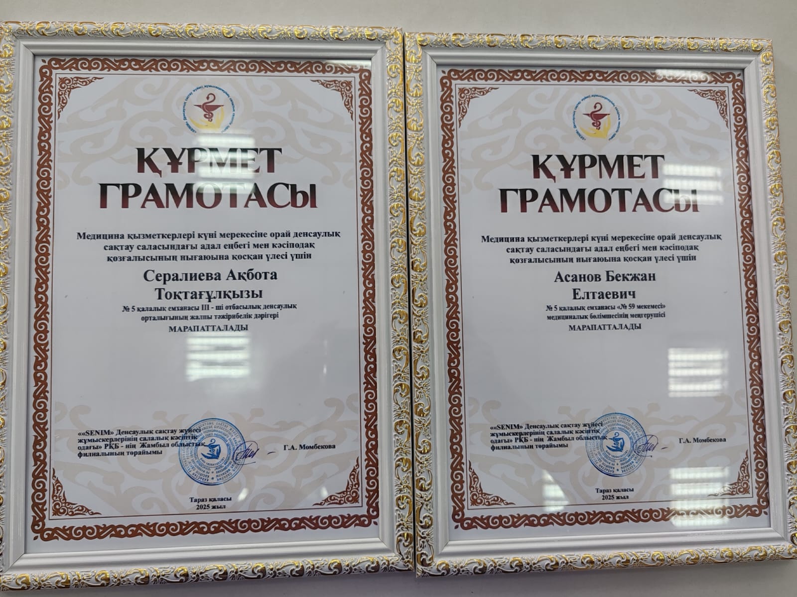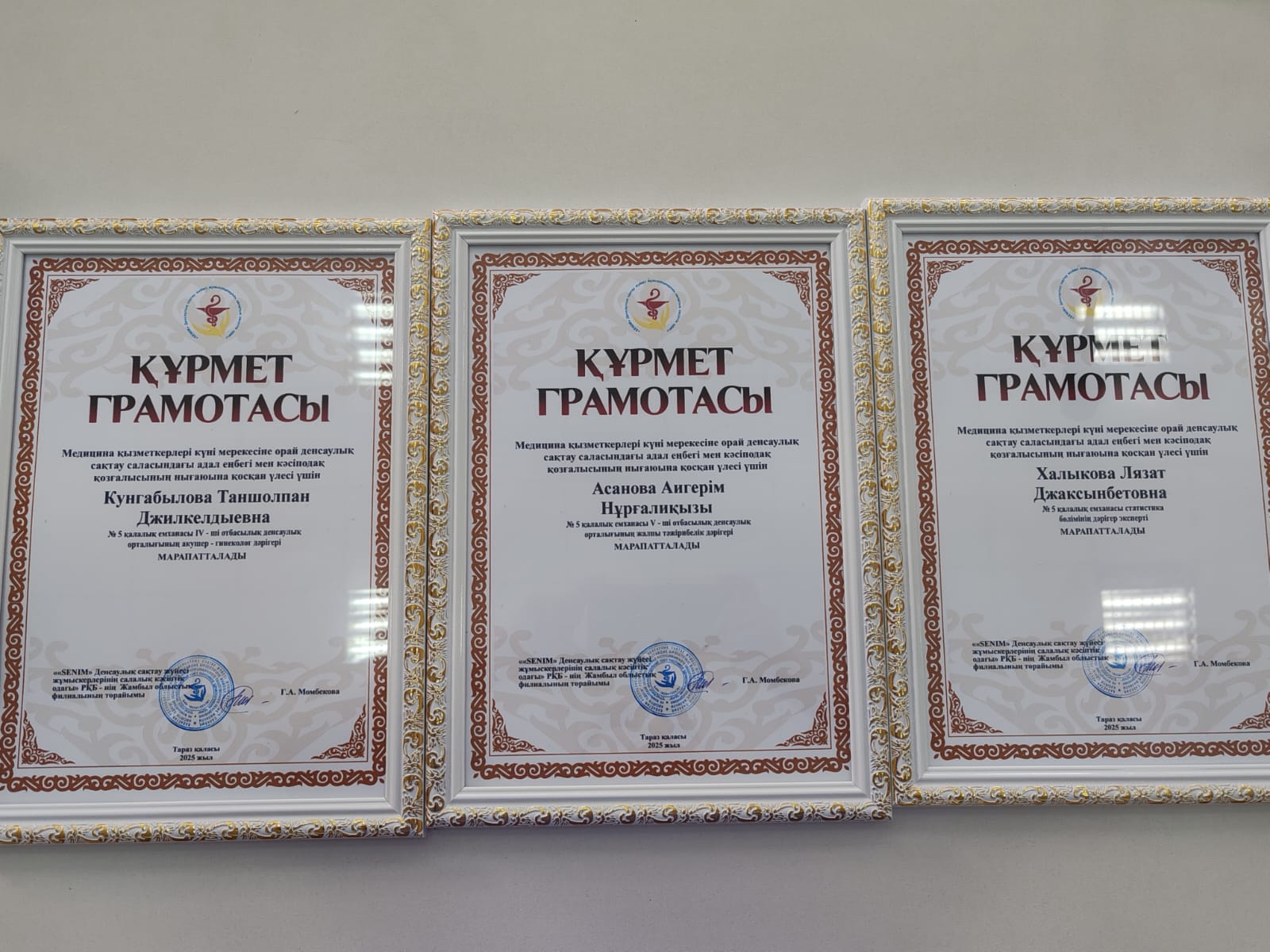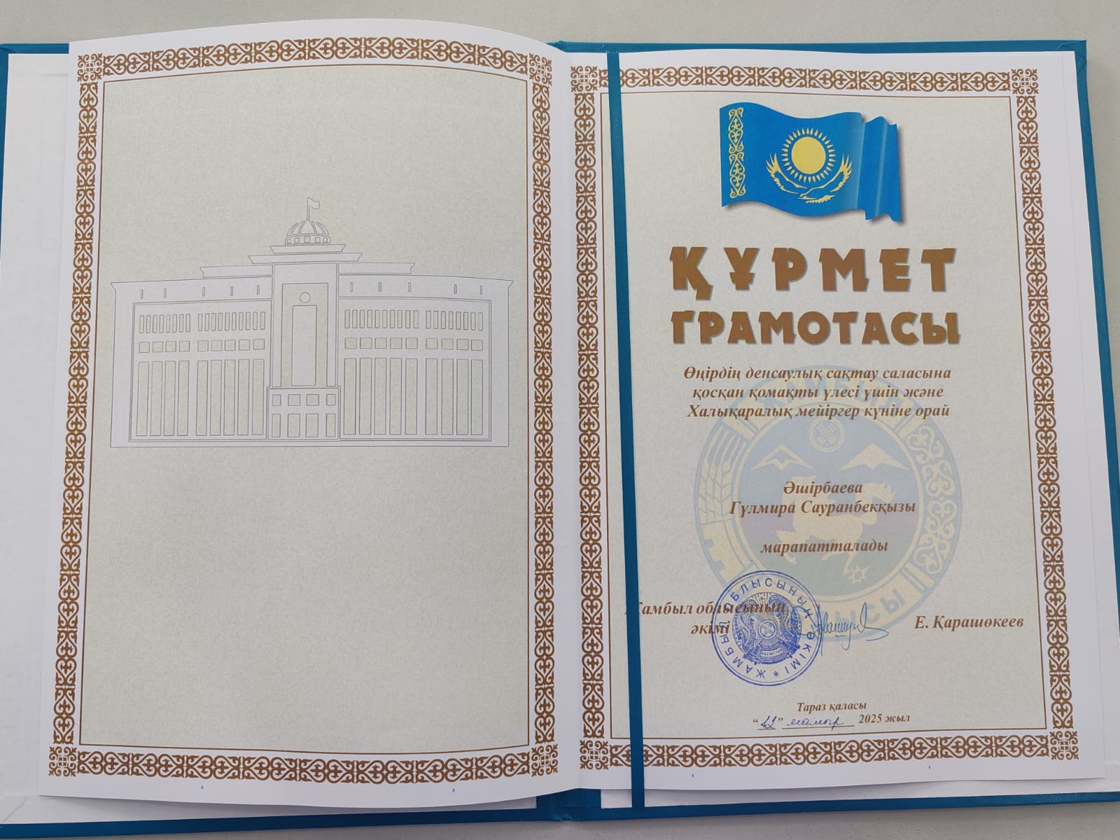 Өңірдің денсаулық сақтау саласына қосқан қомақты үлесі үшін Әшірбаева Гүлмира Сауранбекқызы Жамбыл облысының әкімі Е.Ш. Қарашөкеев атынан ҚҰРМЕТ ГРАМОТАСЫМЕН марапатталды