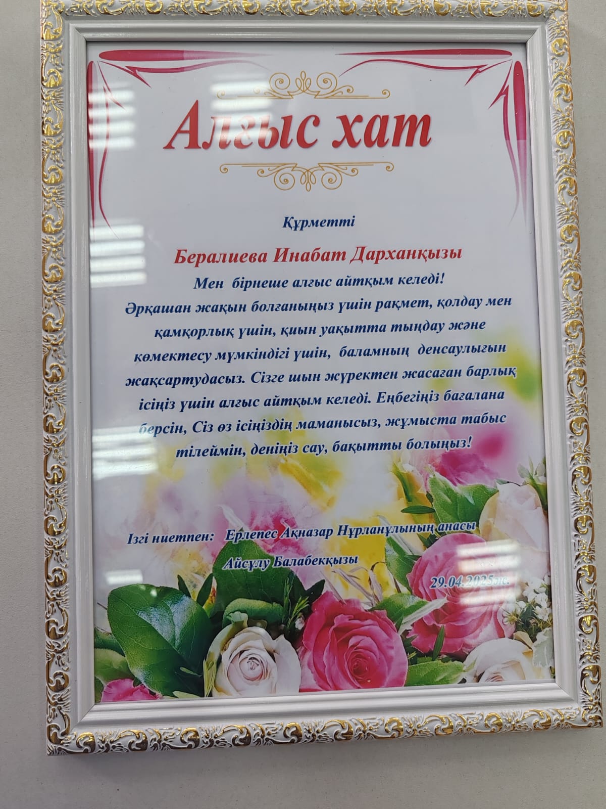 Бералиева Инабат Дарханқызы қолдау және қамқорлық үшін пациенттің мамасы атынан АЛҒЫС ХАТПЕН марапатталды