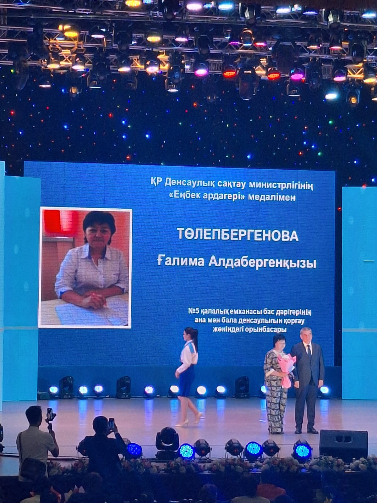 №5 қалалық емхана атынан Төлепбергенова Ғалима Алдабергенқызы бас дәрігердің балалық және босану жөніндегі орынбасары Қазақстан Республикасы Денсаулық сақтау министрлігінің «Еңбек ардагері» МЕДАЛІМЕН марапатталды