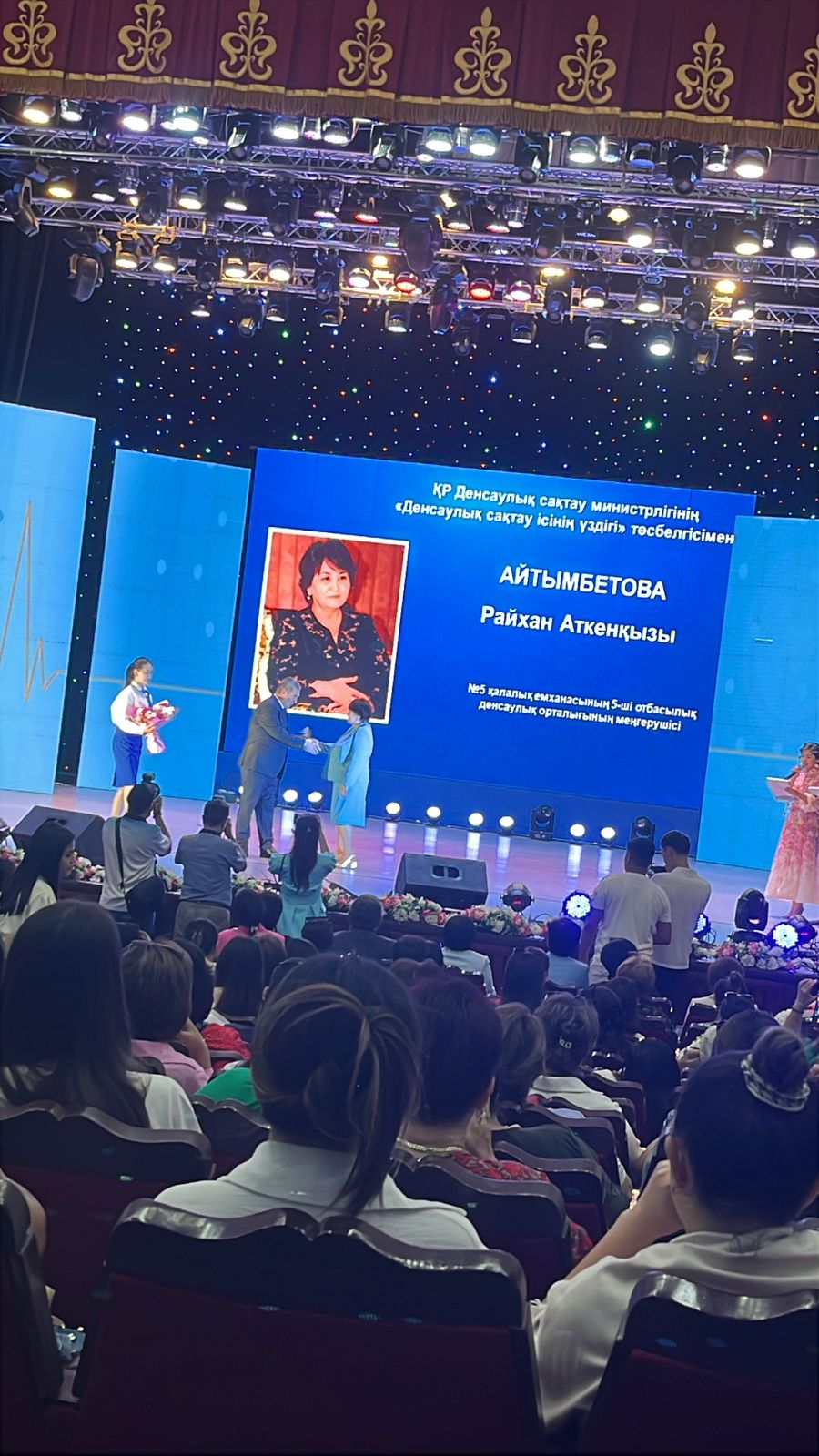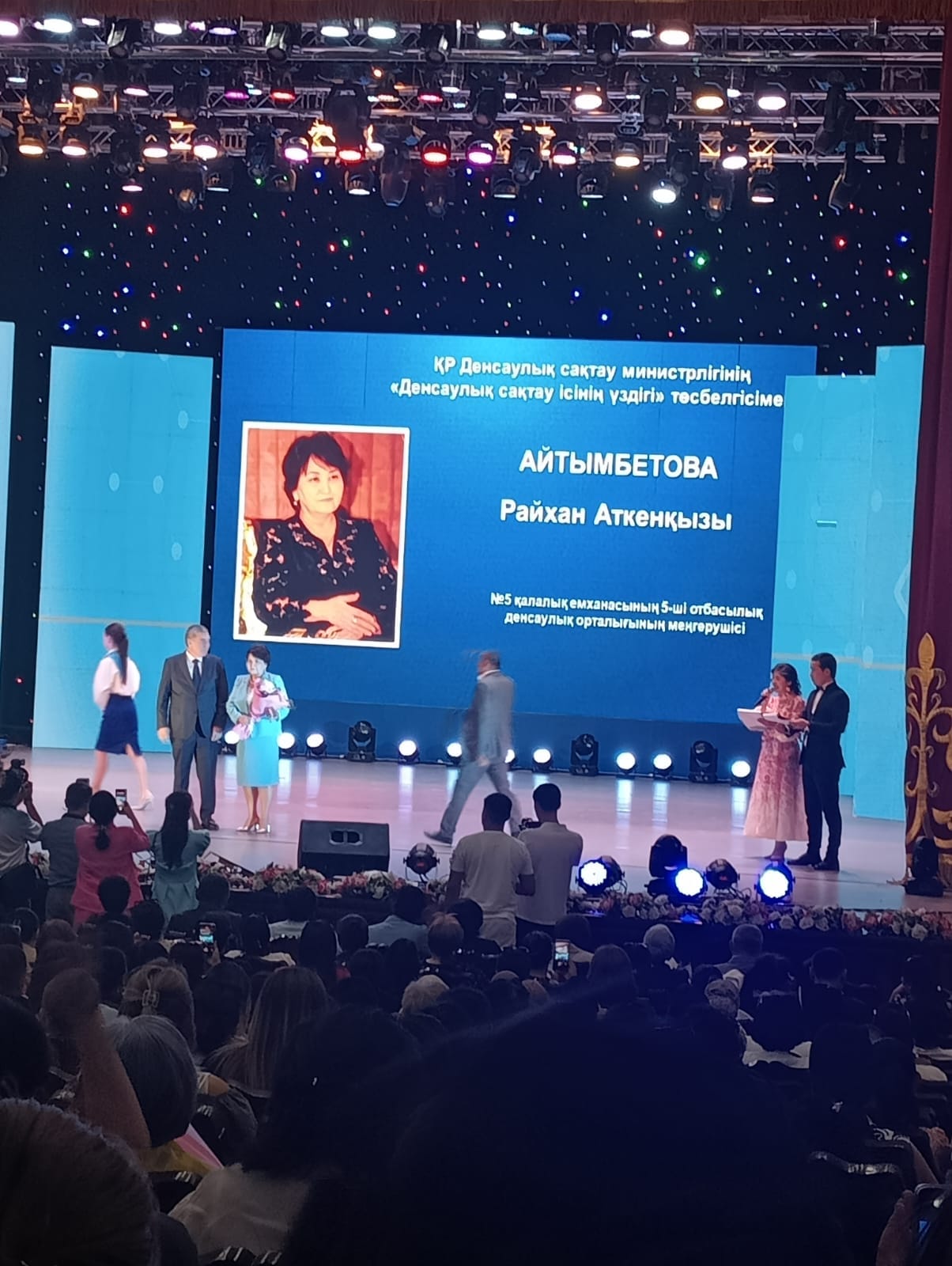 Айтымбетова Райхан Аткенқызы V-ші отбасылық денсаулық орталығының меңгерушісі Қазақстан Республикасы Денсаулық сақтау министрлігінің «Денсаулық сақтау ісінің үздігі» ТӨСБЕЛГІСІМЕН марапатталды