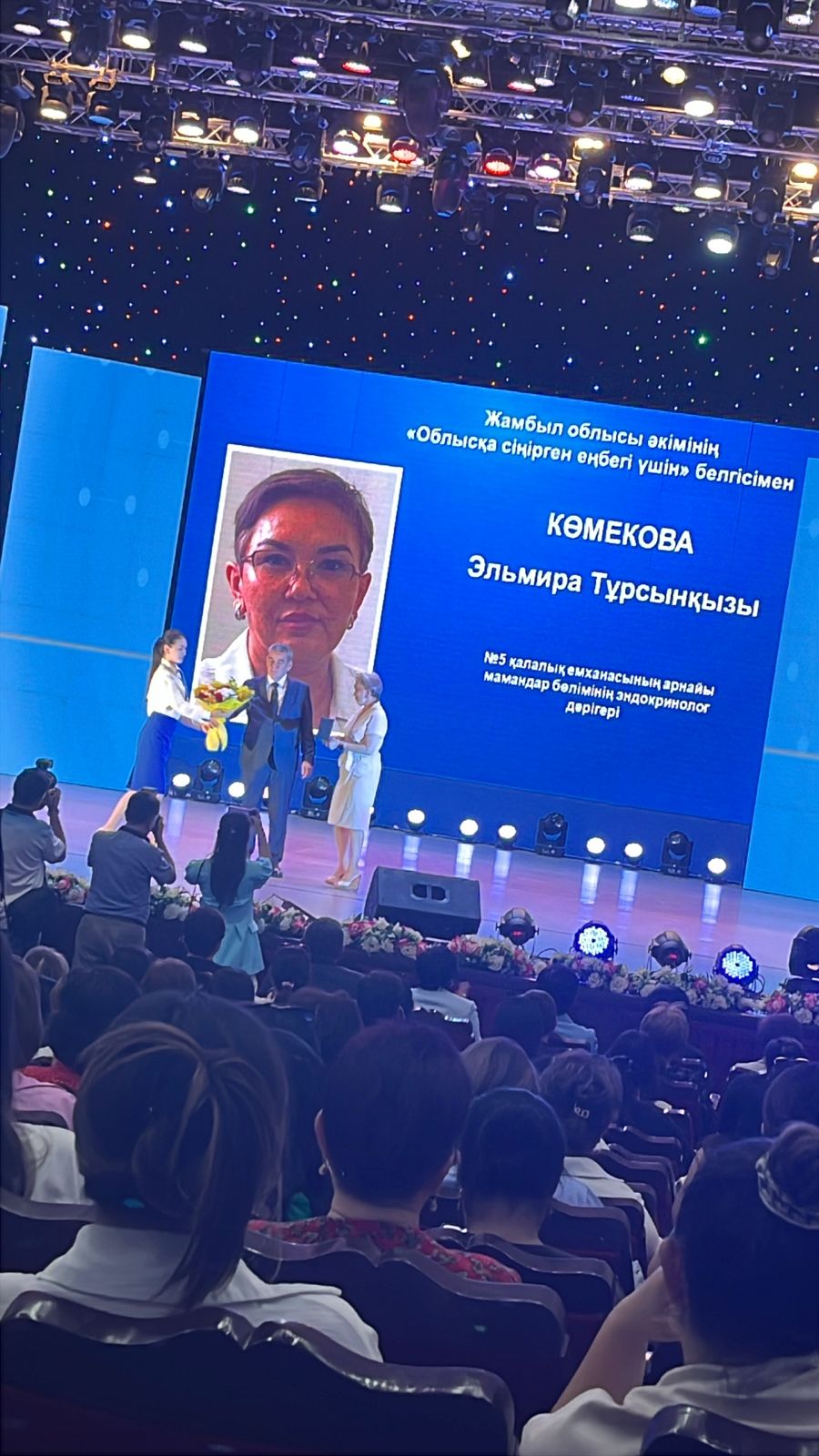 Көмекова Эльмира Тұрсынқызы арнайы мамандар бөлімінің эндокринолог дәрігері Жамбыл облысы әкімінің «Облысқа сіңірген еңбегі үшін» БЕЛГІСІМЕН марапатталды