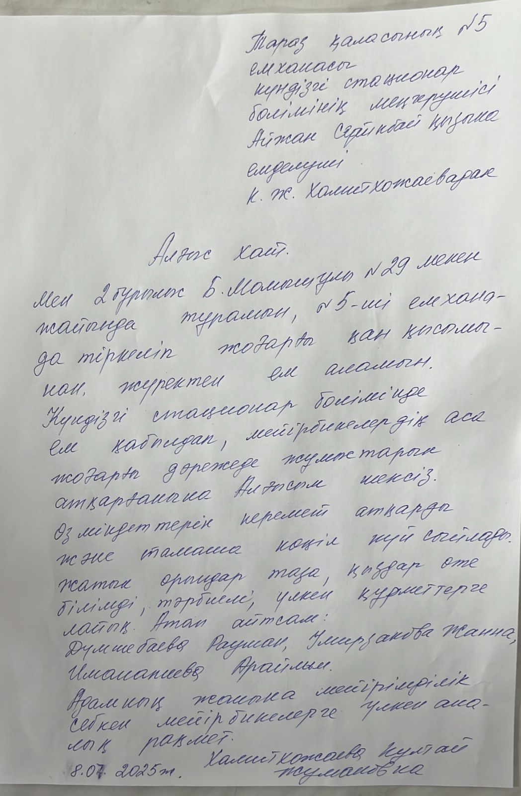Мен 2 бұрылыс Б.Момышұлы №29 мекен жайында тұрамын, №5 қалалық емханада тіркеліп жоғарғы қан қысымынан, жүректен ем аламын. Күндізгі стационар бөлімінде ем қабылдап, мейірбикелердің аса жоғарғы дәрежеде жұмыстарын атқарғандарына Алғысым шексіз. Өз міндеттерін керемет атқарады және тамаша көңіл күй сыйлайды. Жатын орындары таза, қыздар өте білімді, тәрбиелі, үлкен құрметтерге лайық.