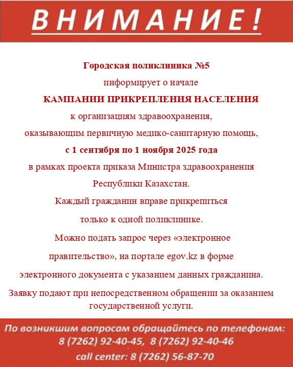 ГКП на ПХВ «Городская поликлиника №5» информирует о начале КАМПАНИИ ПРИКРЕПЛЕНИЯ НАСЕЛЕНИЯ к организациям здравоохранения, оказывающим первичную медико-санитарную помощь, с 1 сентября по 1 ноября 2025 года в рамках проекта приказа Министра здравоохранения Республики Казахстан.
