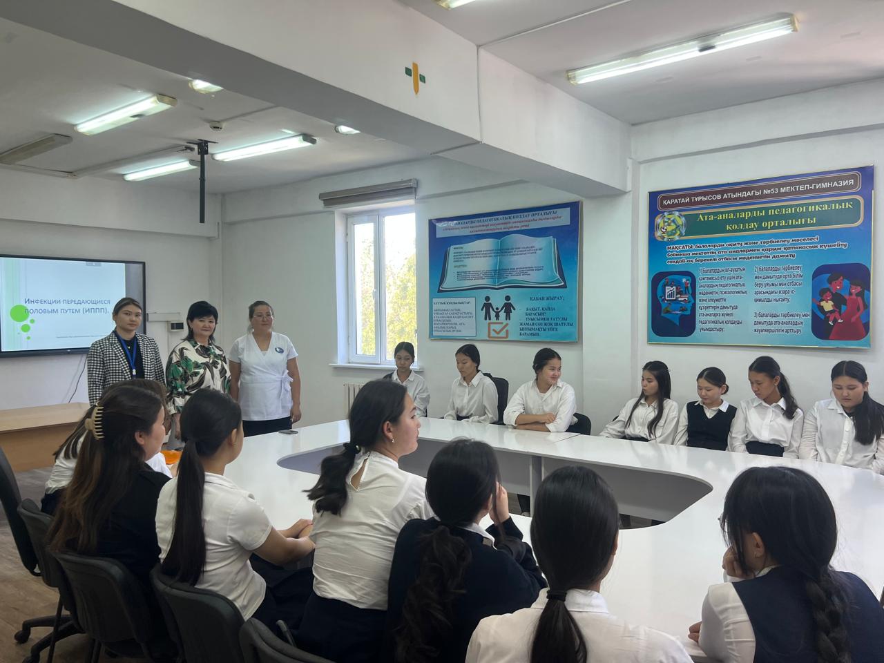 Специалисты городской поликлиники №5 провели профилактические мероприятия в прикрепленных к городской поликлинике №5 учебных учреждениях врач акушер-гинеколог Рустенбекова А.Б., психолог молодежного центра здоровья «Жастар» Жаркынбекова А.Т