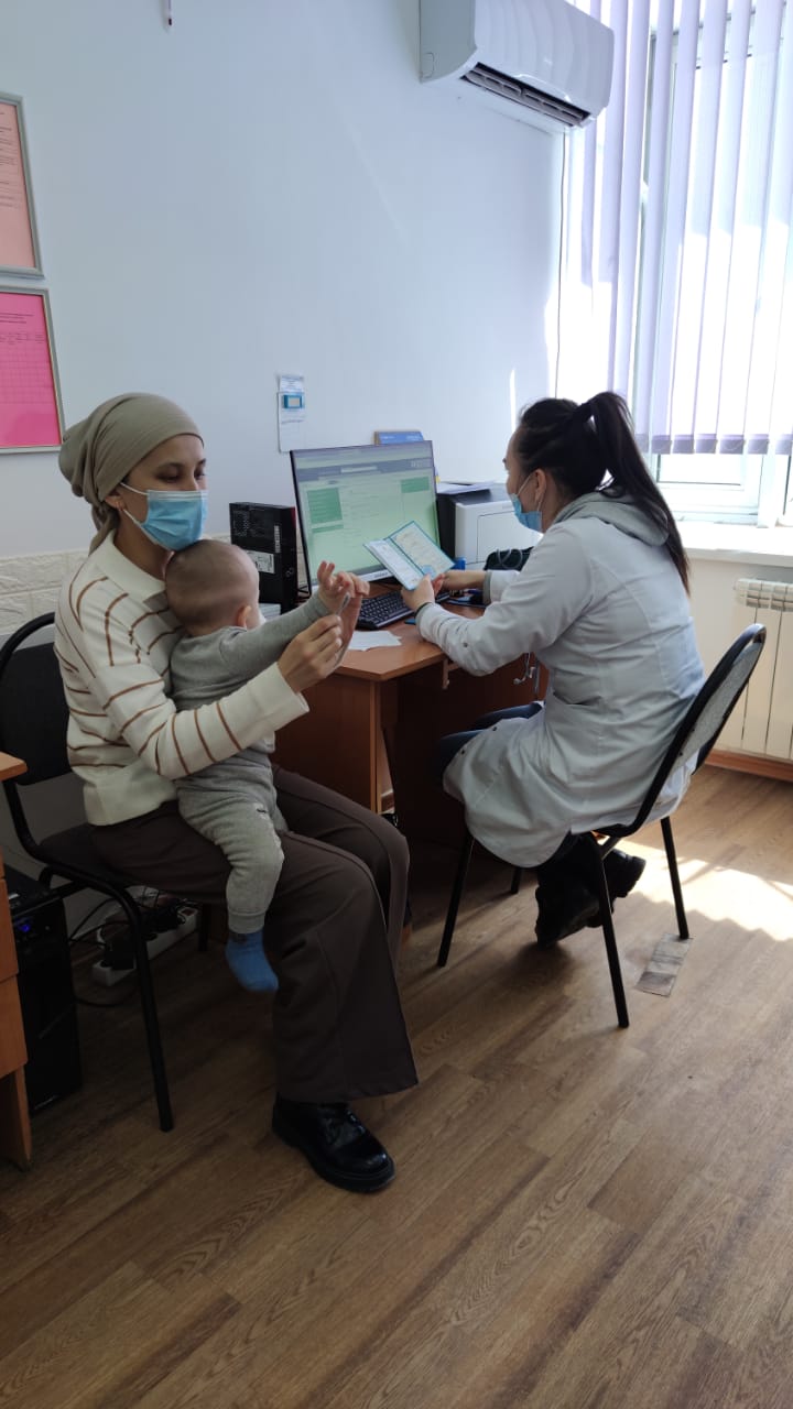 В городской поликлинике №5 врачом общей практики Киргизбаевой Ф.Т. проводиться плановый осмотр ребенка до 1 года. За время приема доктор проводит полный осмотр ребенка, составляет дальнейший план действий (график плановых визитов, возможные консультации у специалистов (при необходимости), а также может ответить на вопросы родителей и дать свои рекомендации