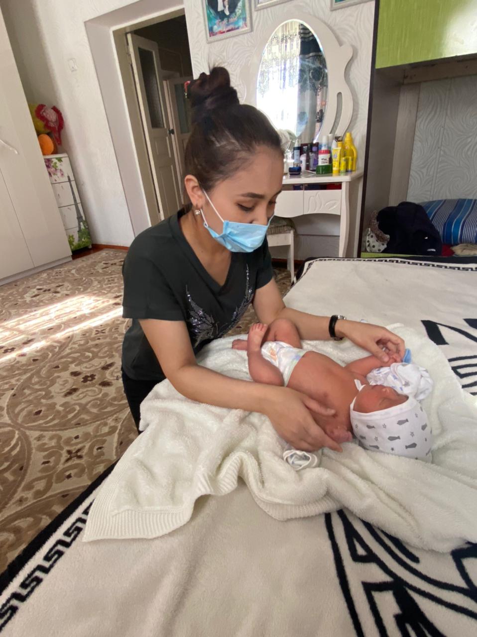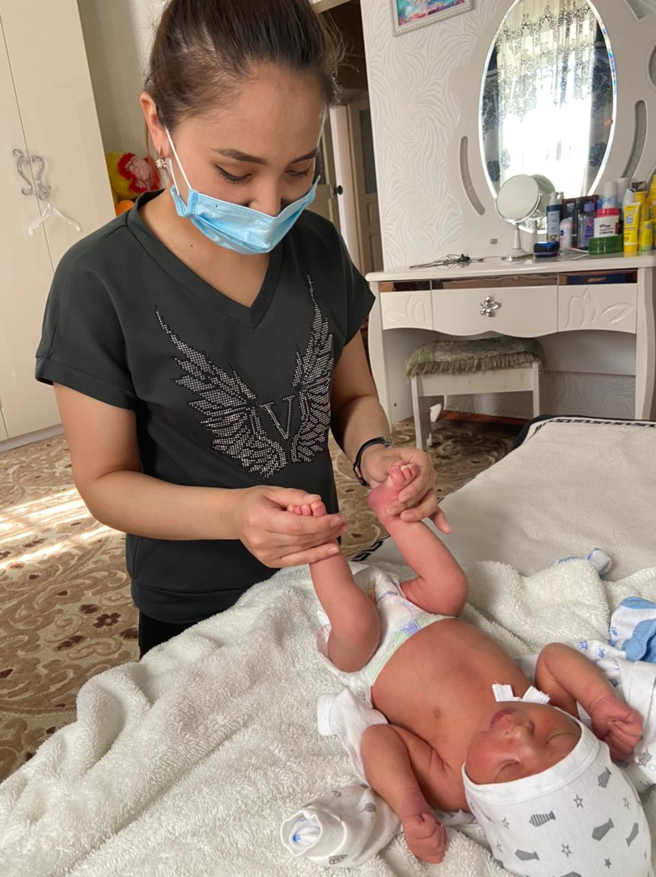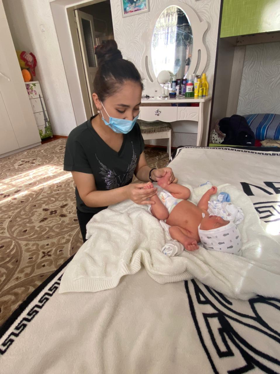 N5 қалалық емхананың 3-ОДО бөлімінің патронажды мейіргері Қосылған Нұрбану жаңа туылған нәрестенің алғашқы 3-күндік патронажын жүргізуде.
