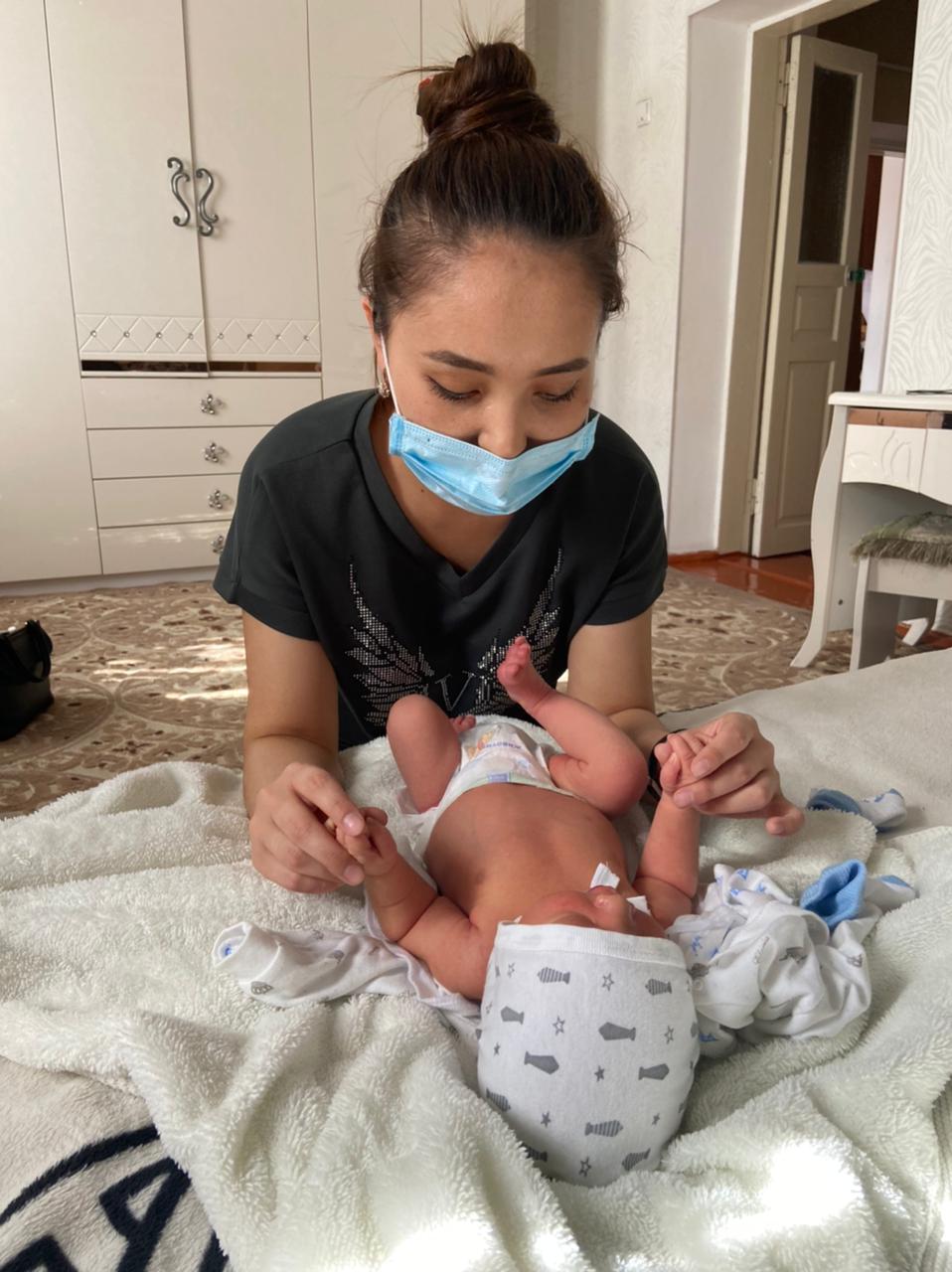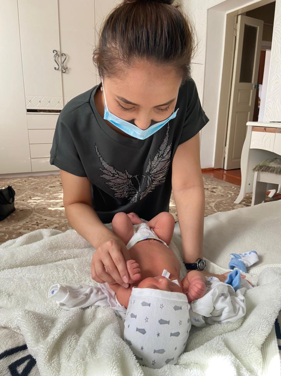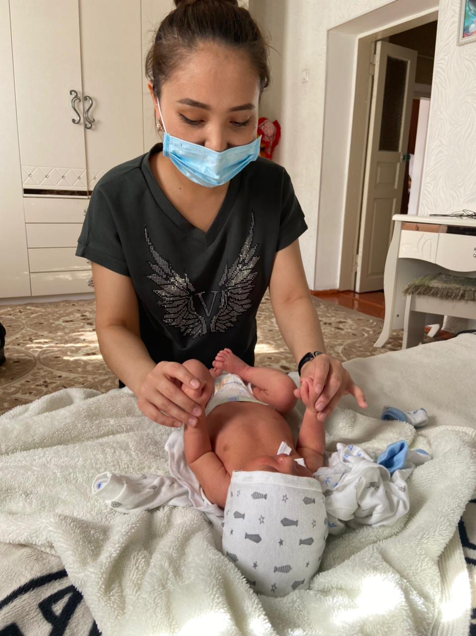 N5 қалалық емхананың 3-ОДО бөлімінің патронажды мейіргері Қосылған Нұрбану жаңа туылған нәрестенің алғашқы 3-күндік патронажын жүргізуде.