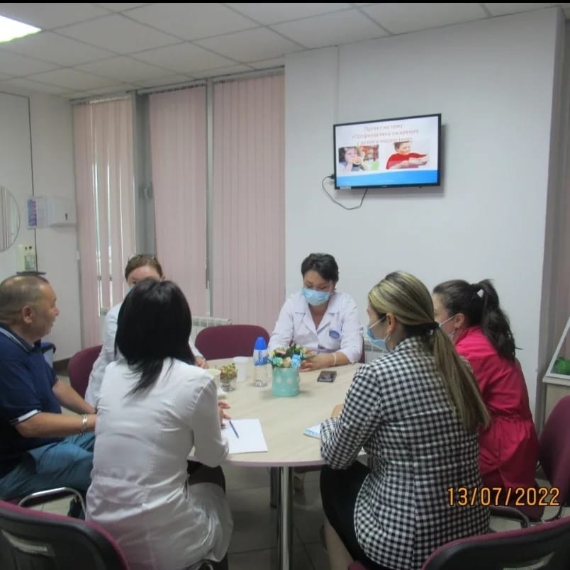 13 июля 2022 года на базе ГКП на ПХВ "Городской поликлиники №5" прошло совещание по проектам Жамбылской области и по подготовке к Международной конференции "Инновации в первичной медико-санитарной помощи (ПМСП)" в г.Тараз с участием представителей УЗ Жамбылской области. Областных и региональных ответственных по проектам Жамбылской области (мужское долголетие, профилактика рака молочной железы, профилактика ОНМК, механизм информированного общественного мониторинга и обратной связи с населением (МИОМОС) и др.) Руководителей центра лучших практик (ЦЛП) и руководителей первичной медико-санитарной помощи (ПМСП) г.Тараз и Жамбылской области: - городская поликлиника №5 - центральная районная больница (ЦРБ) Жамбылского района - центральная районная больница (ЦРБ) Меркенского района - центральная районная больница (ЦРБ) Таласского района Руководитель центральной районной больницы (ЦРБ) Сарысуйского района Эксперты Национальной ассоциации (Абзалова Р.А., Стратулат И.С., Муханова Г.Т.) Абеуова Жамиля Санаковна, директор ММБ Енбекшиказахского района