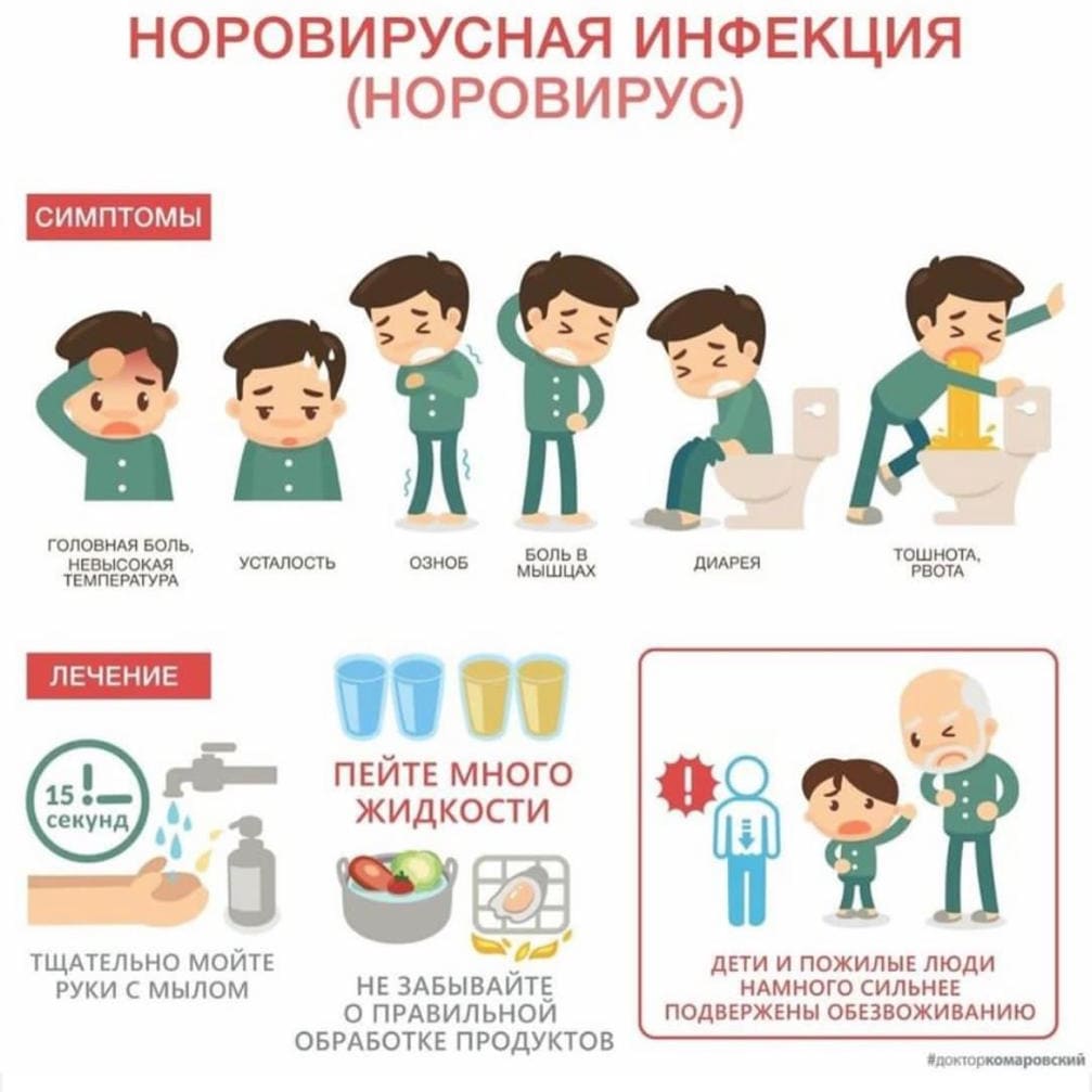 Первые симптомы заболевания появляются через 24-48 часов после заражения. Это может быть однократная, но чаще всего многократная рвота, понос, сильная тошнота, повышение температуры. Норовирус чаще всего вызывает диарею и сильную рвоту, но иногда может быть и только рвота. Нарушения со стороны пищеварительной системы могут сопровождаться мышечными, головными болями и слабостью. Обычно симптомы норовирусной инфекции проходят сами через 12-72 часа. После болезни организм вырабатывает иммунитет к вирусу, но на очень короткий период, около 8 недель. После этого срока человек может снова заразиться норовирусом и заболеть.