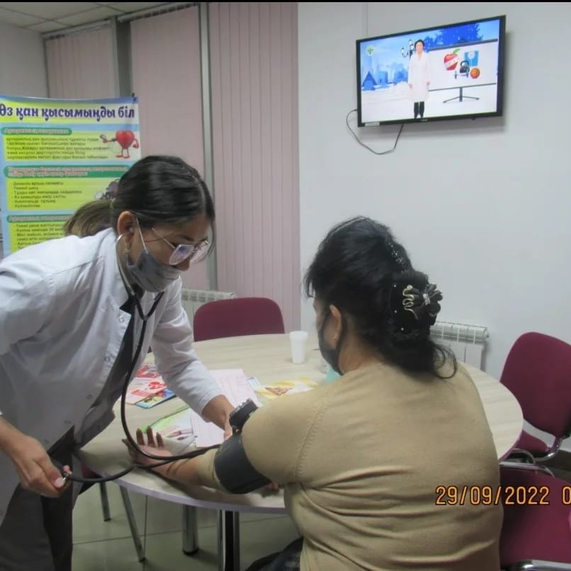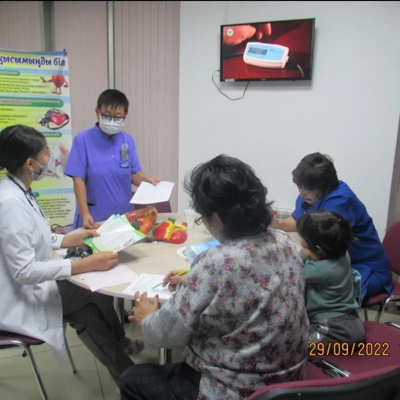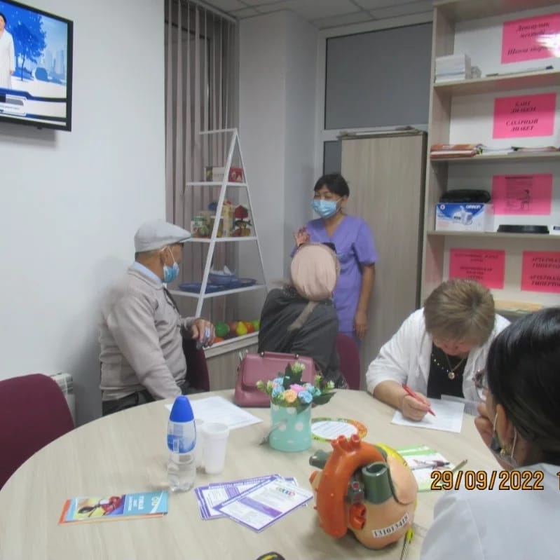29 қыркүйек 2022 жылы Тараз қаласы «№5 қалалық емханада» «Дүниежүзілік жүрек күніне» арналған ашық есік күні өтті. Бұл күні емханаға келген тұрғындар: • Ақкөкиева Тұрсынай Әнуарбекқызы жалпы практика дәрігерінен (ВОП) кеңес алды. Дәрігермен жүрек үлгісінде (муляж) жоғары артериялық гипертензия, холестерин қандай асқынуларға алып келуі мүмкін екенін көрсетілді. • ЭКГ тексеруден өтті • СӨС (салауатты өмір салты) және денсаулық мейіргерілерінен кеңес алды, қан қысымын, қандағы қант деңгейін өлшеді. Тонометр, глюкометр аппараттарымен қалай қолдану керектігі көрсетілді, бейнеролик көрсетілді, буклеттер таратылды, сауалнама толтырылды, сұрақтарға жауап берілді. Барлық іс-шаралар бірінші қабатта 125 бөлмеде өтті.