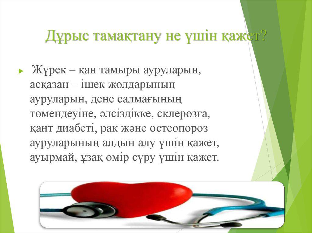Дұрыс тамақтану – организмді дер кезінде жақсы әзірленген тағаммен жабдықтау. Қазіргі жағдайларда тамақтану мәселесі бірқатар себептерге байланысты бірінші орынға шықты, атап айтсақ: экологиялық ортаның бұзылуы, организмге қажет компоненттердің жеткіліксіз түсуі, дұрыс тамақтанбау, сапасы төмен азықтар және т.б. Экология нашарлайды, ал соның нәтижесінде біздің денсаулығымыз бен күшіміз толық жойылады. Организмнің көбінесе, ондағы пайда болатын және оған тамақпен, сумен, ауамен және дәрі-дәрмек заттарымен баратын зиянды заттарды шығаруды қамтамасыз етуге күші жеткіліксіз. Сау адам жейтін асына жиі зейінсіз қарайды. Ал, ауырып, күнделікті жарнама беттерінен түспейтін ең жаңа препараттарды іздей бастайды, сонымен, тамақ сияқты сенімді және тұрақты емдеу құралы туралы ұмытады. Күн сайын, белгілі бір көлемде және ара қатынаста организмге 70-ке жуық қоспа түсуі керек, олардың басым бөлігі организмде синтезделмейді және өмірлік қажетті болып табылады. Организмді осы азық-түлік заттарымен қолайлы жабдықтау түрлі тамақтану кезінде ғана мүмкін. Тамақтану режимі дегеніміз тамақ ішудің жиілігі, еселілігі және алмасуы. Тамақтану режимі азық-түлік заттарына және энергияны қажет ету сияқты жасқа, өндіріс ерекшеліктеріне байланысты түрін өзгертеді. Дұрыс тамақтанудың көрсетілген негізгі принциптерін сақтау оны құнды етеді. Тамақтанудың белгілі бір ережелері бар: 1) ұстамды жеу керек; 2) тамақ құнды болуы керек: онда жеткілікті көлемде белоктар, майлар, көмірсулар, минералды заттар, витаминдер бар болуы керек; 3) тамақтану режимін сақтау қажет. Тамақтану режимінде төрт негізгі принципті ажыратқан дұрыс: 1. Жиілік, яғни, тамақты үнемі бір тәулік уақытында қабылдау. 2. Тәулік барысында тамақтанудың бөлшектілігі. Сау адамға үш немесе төрт фазалық тамақтану ұсынылады, атап айтсақ: таңғы ас, түскі ас, кешкі ас және ұйқы алдында бір стакан айран. 3. Әрбір тамақтанған кезде дұрыс тамақтануды барынша сақтау қажет. Бұл, тамақты әрбір қабылдаған кезде азық-түліктер жинағы организмге белоктарды, майларды, көмірсуларды, сонымен қатар витаминдер мен минералды заттарды қолайлы ара қатынаста жеткізу тұрғысынан ойланып істелінуі керек. 4. Бір күнде тамақ ішу бойынша физиологиялық негізделіп бөлінуі. Төрт мезгіл тамақтану едәуір жағымды: жұмысқа дейін тоқ тамақ (күндіз дұрыс тамақтанудың жалпы калориялылығының 25-30 %), жұмыс арасындағы үзілісте жеңіл екінші таңғы ас (жалпы калориялылықтың 10-15 % ), құнарлы түскі ас (калориялылықтың 35-40 %), салыстырмалы жеңіл кешкі ас (жалпы калориялылықтың 15-20 %). Таңғы ас, түскі ас және кешкі ас үшін тәуліктік уақыт еңбек және демалыс режиміне байланысты жеткілікті кең шеңберде өзгеруі мүмкін. Алайда, тамақ ішу арасындағы аралық 4-5 сағат болуы маңызды. Жүргізілген зерттеулер негізінде, кешкі ас пен ұйқының алдындағы аралықта 2-3 сағат өтуі керек. Тамақтану режимімен қатар, кейбір психологиялық ережелерді сақтау артық болмайды. 1. Үстелге шаршаған күйде отырмаңыз. Қанша аш болсаңыз да, ең болмағанда 10 минут демала тұрыңыз. 2. Ашулы, шошынған күйде, қайғылы сезімдерге берілгенде тамақ ішпеңіз. 3. Өзіңізге қатты ұнамайтын адаммен бірге үстел басына бірге отырмаңыз. 4. Егер сізге қандай да бір тағам ұнамаған болса, пайдалы болса да оны татып көруге болмайды. Сізге ол бәрібір пайдасын тигізбейді. 5. Қарныңыз ашқанша үстелге оты