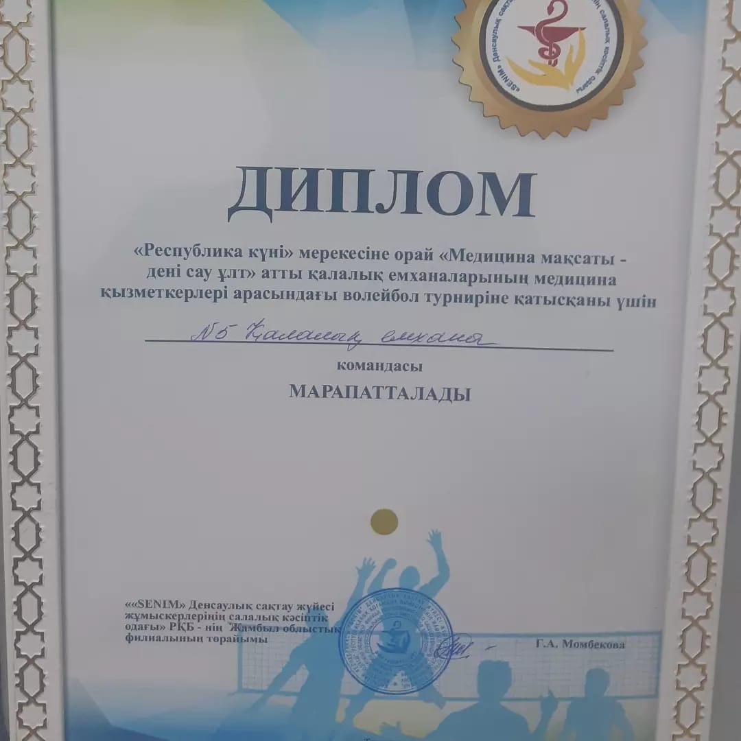 22 қазан 2022 жылы Жақсылық Үшкемпіров атындағы «Тараз-Арена» спорт сарайында Республика күні мерекесіне орай «Медицина мақсаты – дені сау ұлт» атты қалалық емханаларының медицина қызметкерлері арасында волейбол спорт түрінен турнир өтті