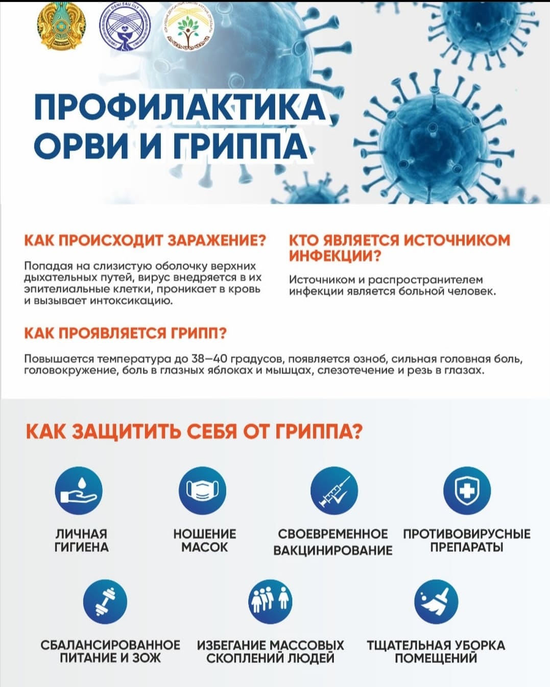 ЖРВИ жылдың суық мезгілінде қазан қараша айларында дамиды. Бастапқы кезіңінде вирус тыныс жолдары мен кіре беріс қақпағында дамиды яғни мұрында, жұтқыншақ және көмейде ол мынадай белгілер Құрғақ жөтел Мұрын бітелуі Кейін вирус қанға түсіп жалпы интоксикация белгілер шақырады яғни бас ауру , озноб , арқа мен аяқта ауырсыну, ылғал жөтел және қақырық. ЖРВИ симптомдары асқынуы: Синусит, ринит , отит, пневмония, менингит сынды аурулар ға әкеледі. Емі. Дезинтоксикалық терапия Спирт ерітіндісімен уқалау Жылы ванна Ыстық түсіретін свечалар Антигистаминді препараттар және ингаляция жасау.