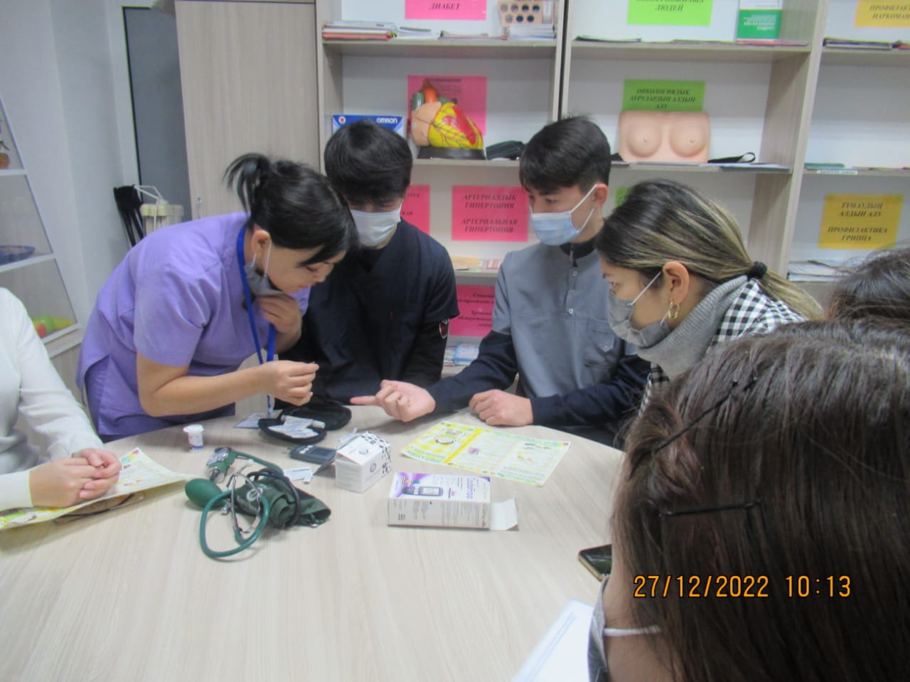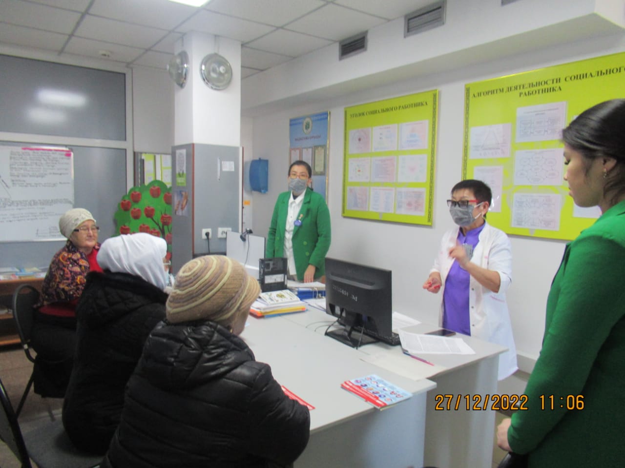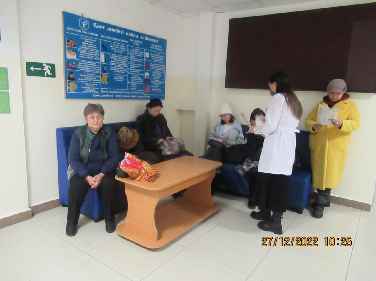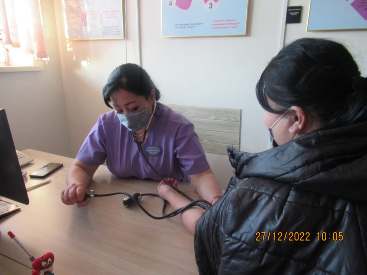 «БЕЙБІТШІЛІК пен КЕЛІСІМ» жобасын іске асыру бойынша іс-шаралар жоспары бағыты: «ӘЛЕУМЕТТІК-ТҰРМЫСТЫҚ МӘСЕЛЕЛЕРДІ ШЕШУ ЖӘНЕ БИЗНЕСТІ ДАМЫТУ» тобының іс шаралар жоспарына сай 2022 жылдың 27 желтоқсан күні Тараз қаласы «№5 қалалық емханасында «Денсаулық мектебінің сабақтары» тақырыбында Ашық есік күні өтті. Бұл күні емханаға келген тұрғындарымыз: 1) 110,111 бөлмелерінде сағат 09.00-12.00 скринингтен өтіп, қан қысымын, көзішілік қысымды, қант деңгейін, бойды, салмақты өлшеп, Кетле массасының индексі шығарылды. 2) сағат 09.00-12.00 1) «Артериялық гипертензия және жүректің ишемиялық ауруы» денсаулық мектебі 2) «Қант диабеті» денсаулық мектебі 3) «Өкпенің созылмалы обструктивті ауруы» денсаулық мектебі 4) «Белсенді ұзақ өмір сүру» денсаулық мектебі 5) «Инсульттің алдын алу» денсаулық мектебі 6) «Мінез-құлық қауіп факторлары» денсаулық мектебі 125 бөлмеде денсаулық мектебінің жауапты мейіргерілерінен кеңес алып, анкета толтырылды, видео көрсетілді, буклеттер таратылды 101 бөлмеде психологтың және 128 бөлмеде әлеуметтік қызметкер мамандарынан консультациясын өте алды.