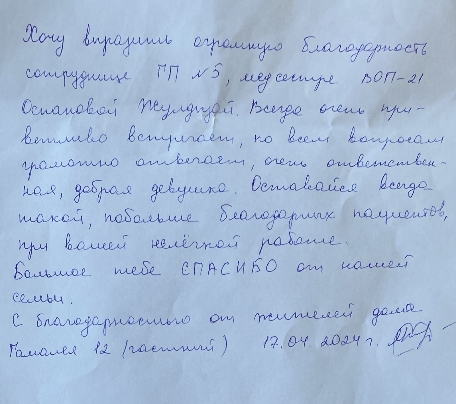 Хочу выразить огромную благодарность сотруднице городской поликлиники №5, медсестре ВОП-21 Оспановой Жулдызай.