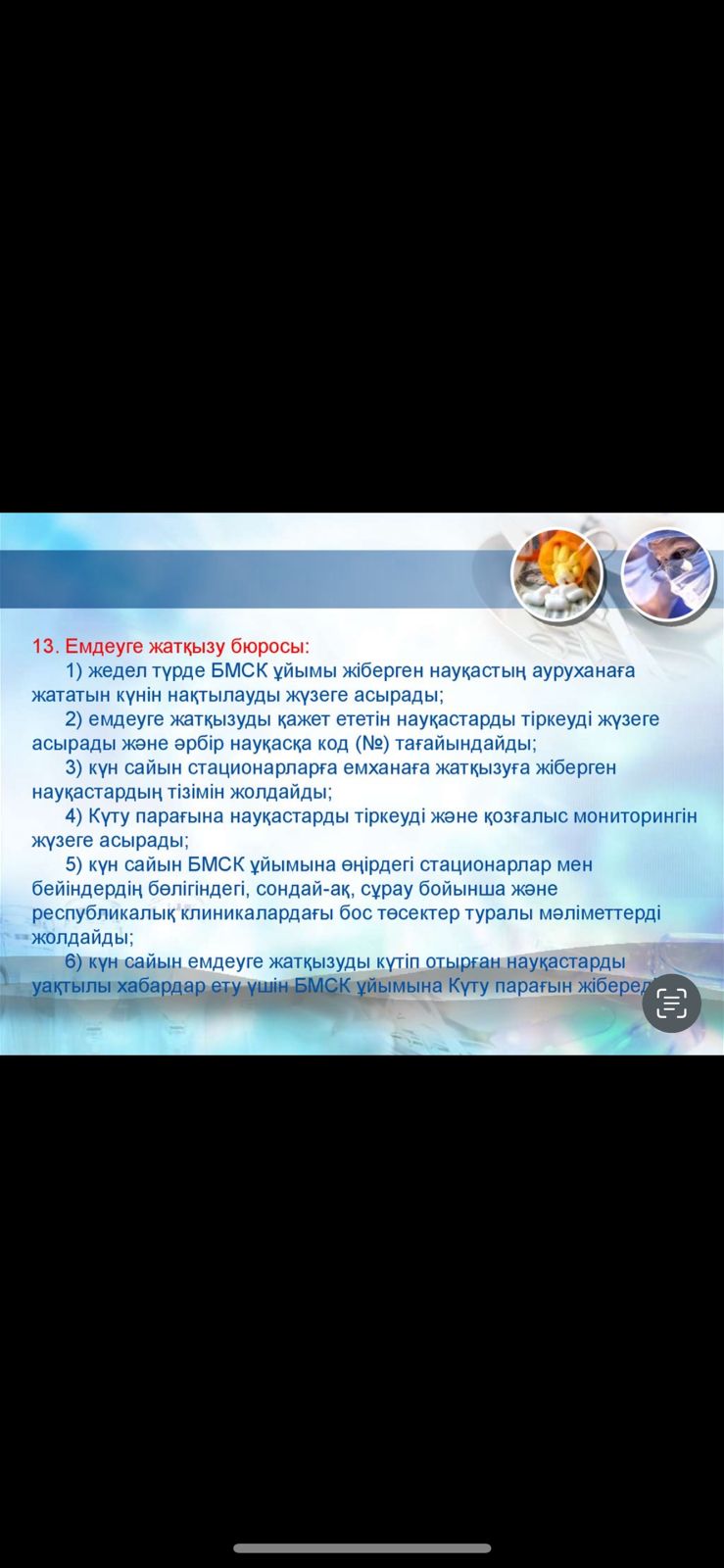 Емдеуші дәрігер стационар бөлімшесінің меңгерушісімен бірігіп емдеуге жатқызу қажеттілігі туралы шешім қабылдайды. Жоспарлы түрде емдеуге жатқызу үшін көрсетілімдер анықталған жағдайда, пациент медициналық ұйымды таңдауы және өз таңдауын хабарлауы тиіс. Емдеуге жатқызу қажеттілігі туралы шешім қабылданған жағдайда, дәрігер Емдеуге жатқызу бюросының порталында пациенттің деректерін тіркей отырып, жолдаманы ресімдейді. (Денсаулық сақтау ұйымын таңдау бойынша пациенттің тілектерін ескере отырып міндетті түрде).