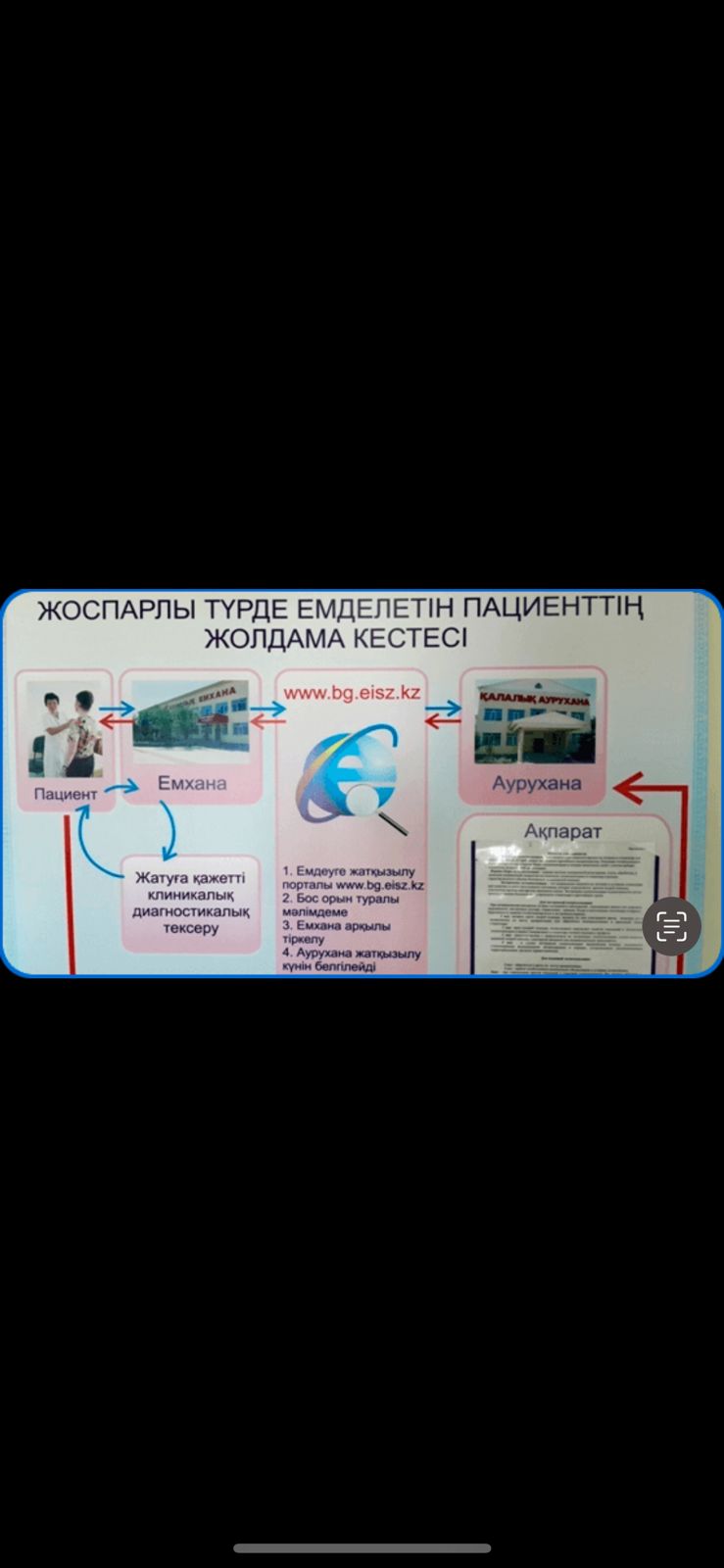 Жоспарлы емдеуге жатқызу – көрсетілімдер (анықталған жағдайда) болған жағдайда, созылмалы аурулар және жедел дәрігерлік араласуды талап етпейтін өмірге қауіпсіз жағдайларда дәрігердің пациентті емдеуге жолдауы. Жоспарлы түрде емдеуге жатқызу порталы арқылы бірнеше күн ішінде науқастың медициналық ұйымды таңдауына байланысты іске асырылады.Бекітілген мекенжайы бойынша дәрігерге жүгіну. Көрсетілімдер болған жағдайда емхананың емдеуші дәрігері оны қарап, ауруды диагностикалау үшін қажетті зерттеулердің толық көлемін тағайындайды.