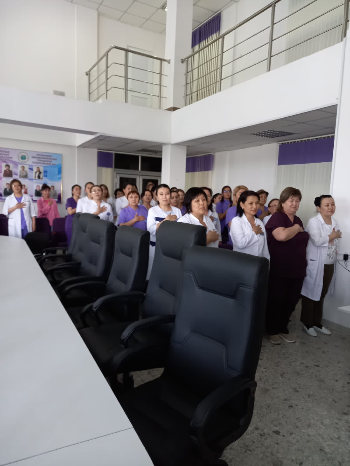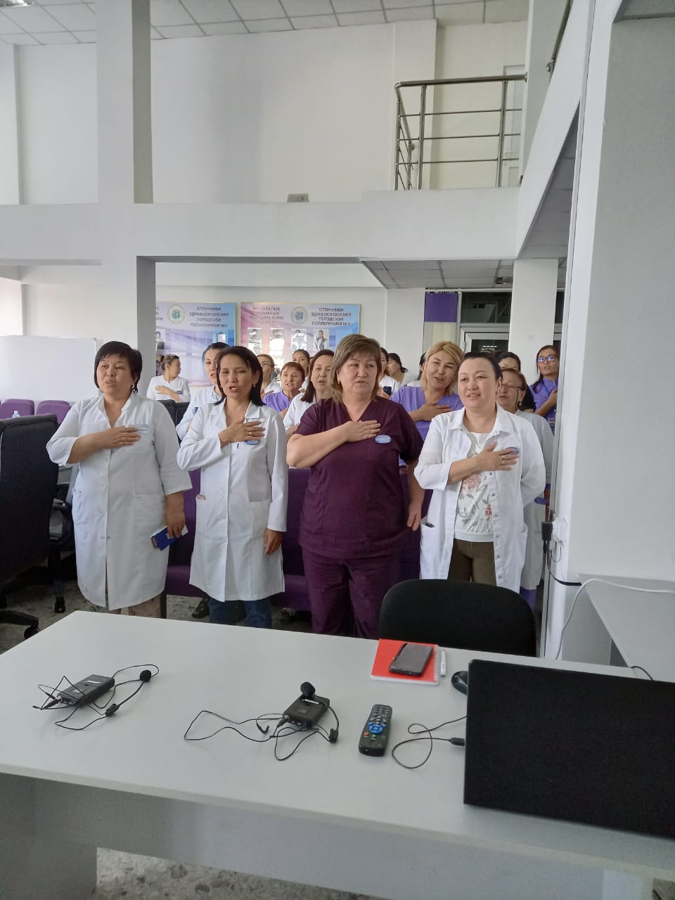 Қалалық емхана қызметкерлері 4-маусым күні сағат 10.00-де Қазақстан Республикасының Мемлекеттік Гимнін орындады.
