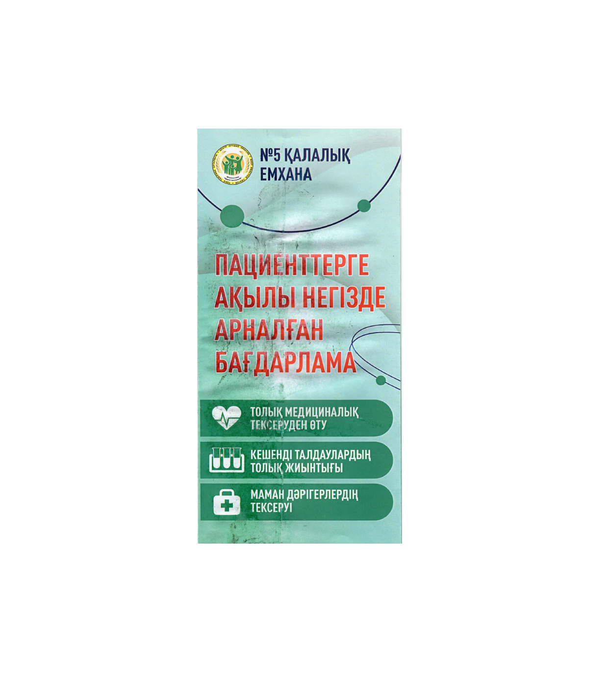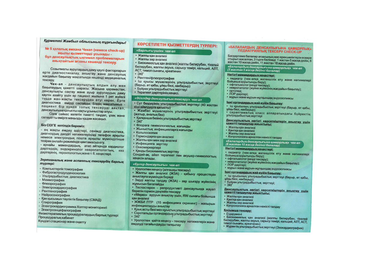 № 5 қалалық емхана Чекап (немесе check-up) ақылы қызметтерді ұсынады - бұл денсаулықтың ықтимал проблемаларын анықтайтын ағзаны кешенді тексеру.