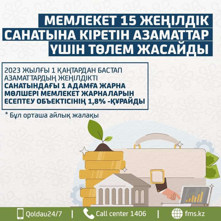 ✅ МЕМЛЕ-КЕТ 15 ЖЕҢІЛДІК САНАТЫНА КІРЕТІН АЗАМАТТАР ҮШІН ТӨЛЕМ ЖАСАЙДЫ 2023 жылғы 1 қаңтардан бастап азаматтардың жеңілдікті санатындағы 1 адамға жарна мөлшері Мемлекет жарналарын есептеу объектісінің 1,8% -. құрайды* * Бұл мемлекеттік статистика саласындағы уәкілетті орган айқындайтын ағымдағы қаржы жылының 2 жылының алдындағы орташа айлық жалақы.