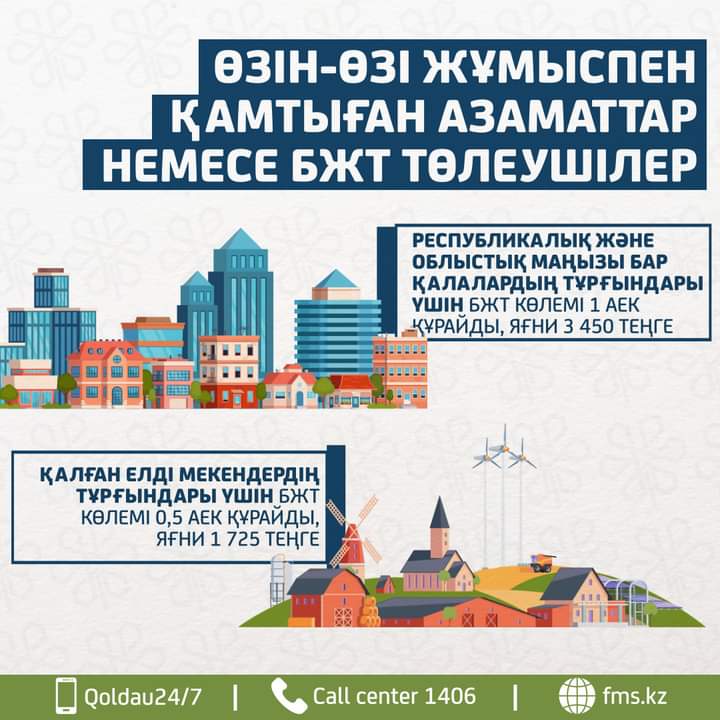 ✅ ӨЗІН-ӨЗІ ЖҰМЫСПЕН ҚАМТЫҒАН АЗА-МАТТАР НЕМЕСЕ БЖТ ТӨЛЕУШІЛЕР ✔️ Республикалық және облыстық маңызы бар қалалардың тұрғындары үшін БЖТ көлемі 1 АЕК құрайды, яғни 3 450 теңге ✔️ Қалған елді мекендердің тұрғындары үшін БЖТ көлемі 0,5 АЕК құрайды, яғни 1 725 теңге